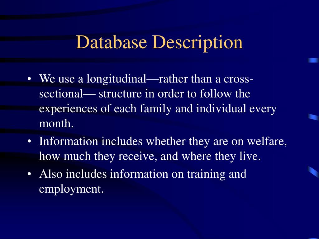 Database Description • We use a longitudinal—rather than a cross-sectional— structure in order to follow the experiences of each family and individual every month. • Information includes whether they are on welfare, how much they receive, and where they live. • Also includes information on training and employment.
