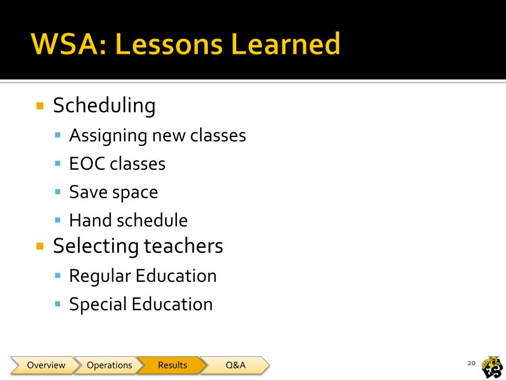 WSA: Lessons Learned • Scheduling • Assigning new classes • EOC classes • Save space • Hand schedule • Selecting teachers • Regular Education • Special Education • 20