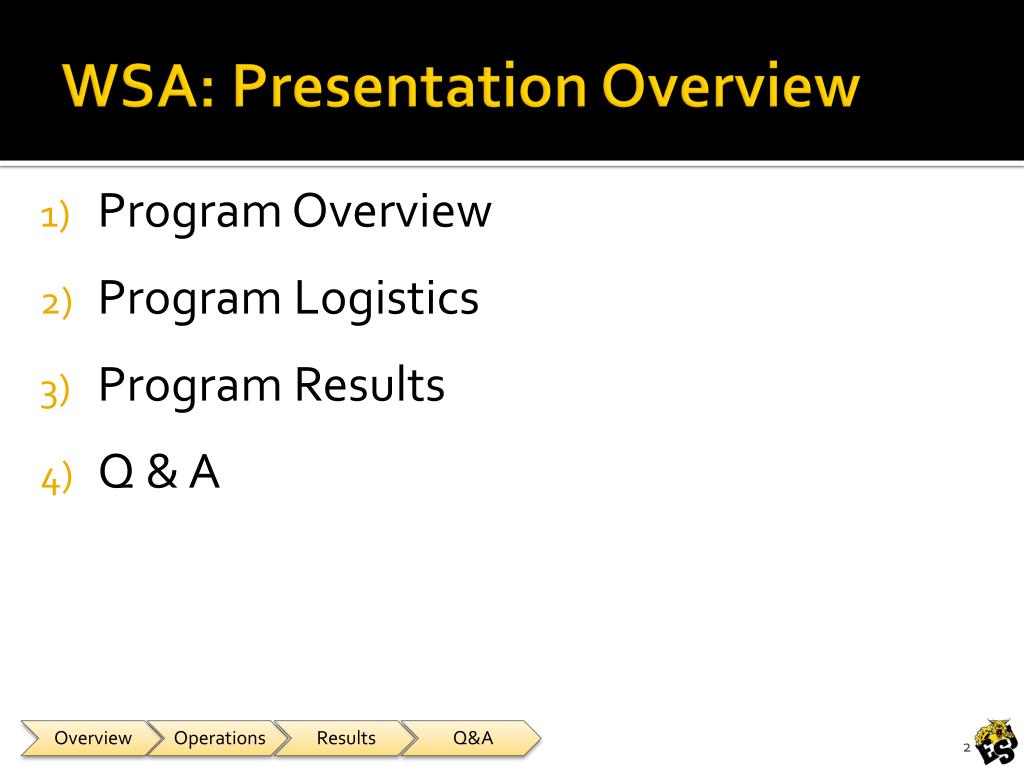 WSA: Presentation Overview • Program Overview • Program Logistics • Program Results • Q & A