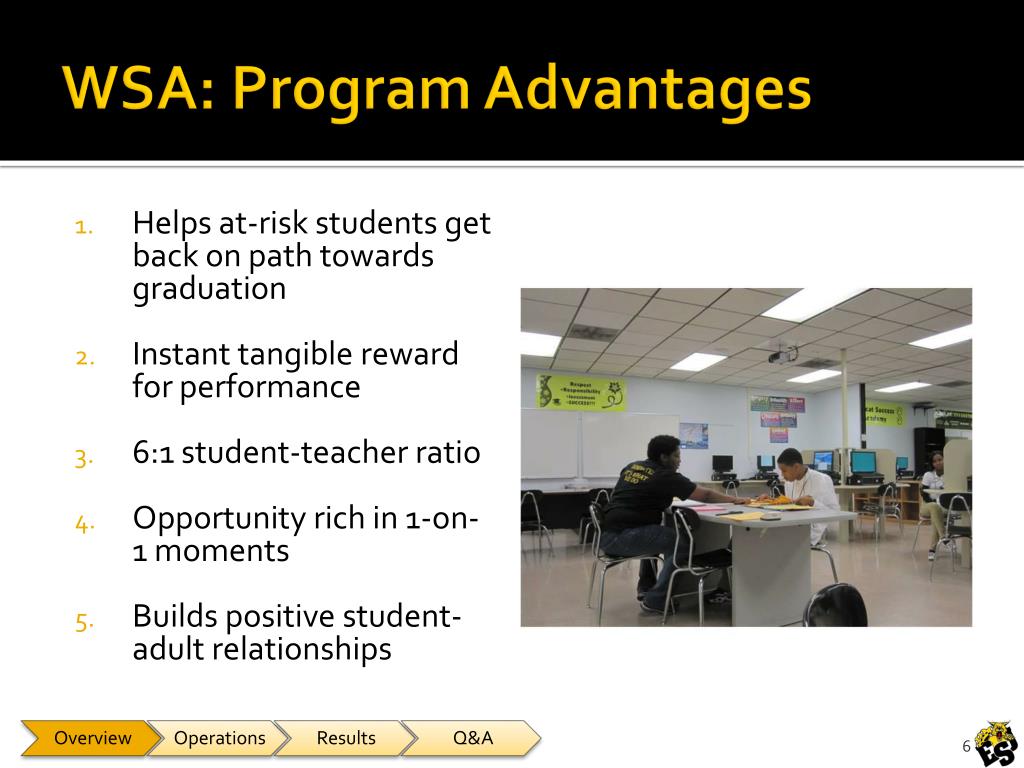 WSA: Program Advantages • Helps at-risk students get back on path towards graduation • Instant tangible reward for performance • 6:1 student-teacher ratio • Opportunity rich in 1-on-1 moments • Builds positive student-adult relationships
