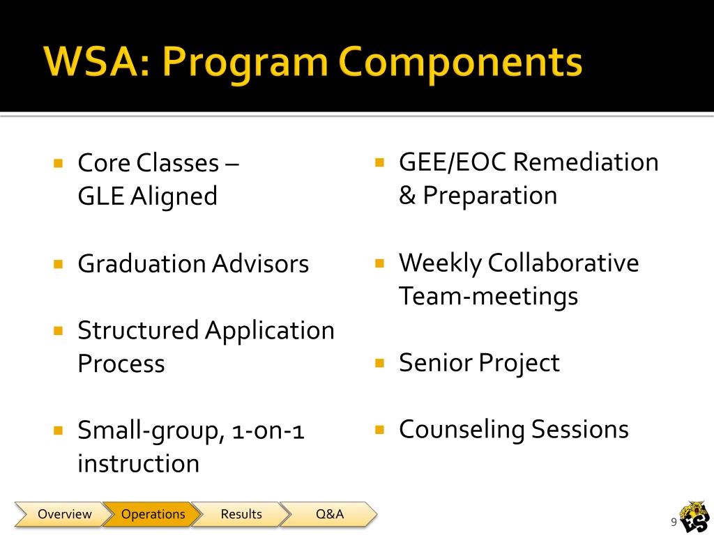 WSA: Program Components • Core Classes – GLE Aligned • Graduation Advisors • Structured Application Process • Small-group, 1-on-1 instruction • GEE/EOC Remediation & Preparation • Weekly Collaborative Team-meetings • Senior Project • Counseling Sessions