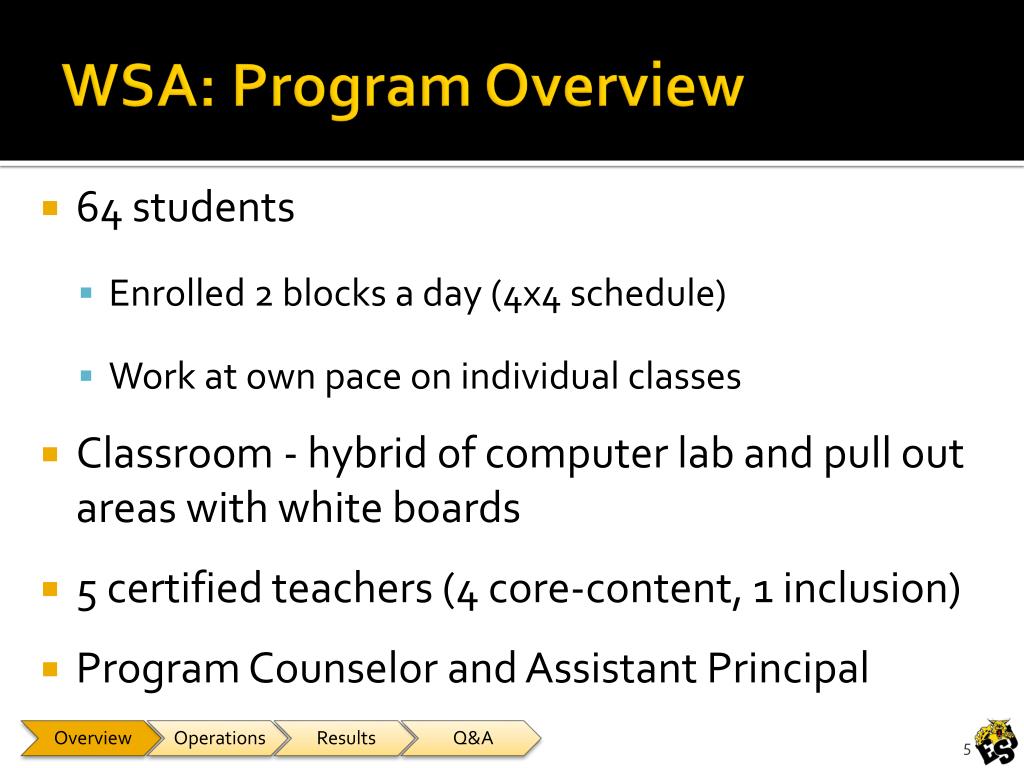 WSA: Program Overview • 64 students • Enrolled 2 blocks a day (4x4 schedule) • Work at own pace on individual classes • Classroom - hybrid of computer lab and pull out areas with white boards • 5 certified teachers (4 core-content, 1 inclusion) • Program Counselor and Assistant Principal