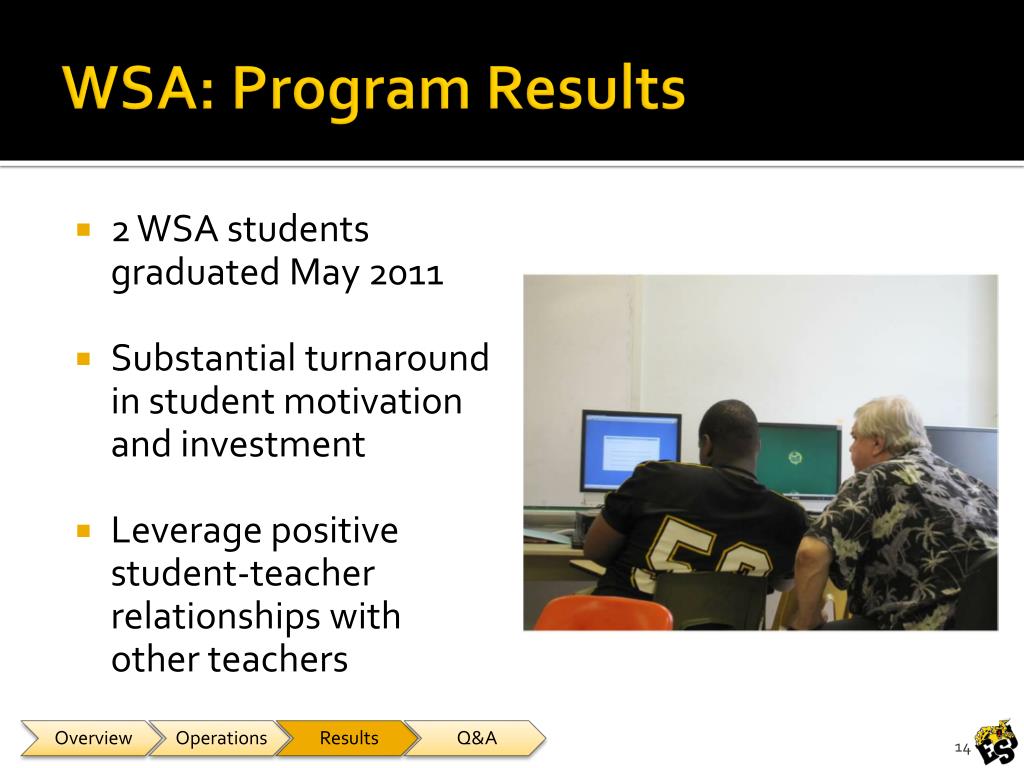 WSA: Program Results • 2 WSA students graduated May 2011 • Substantial turnaround in student motivation and investment • Leverage positive student-teacher relationships with other teachers