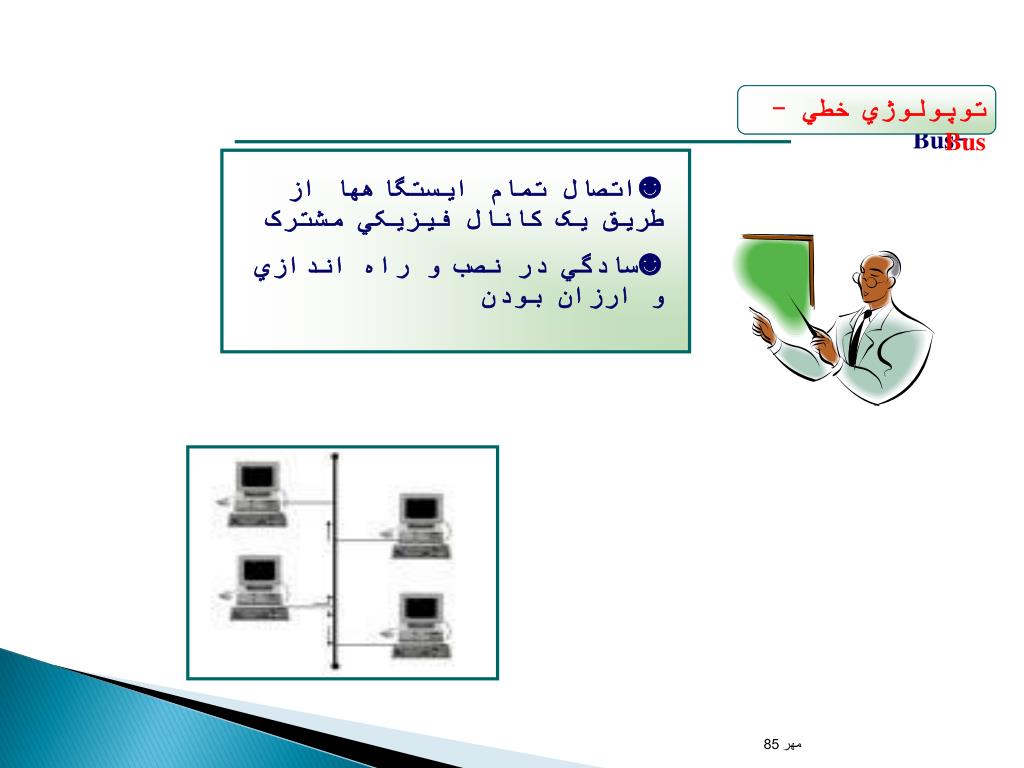 توپولوژي خطي - Bus توپولوژي خطي -Bus ☻اتصال تمام ايستگاهها از طريق يک کانالفيزيکي مشترک ☻سادگي در نصب و راه اندازي و ارزانبودن