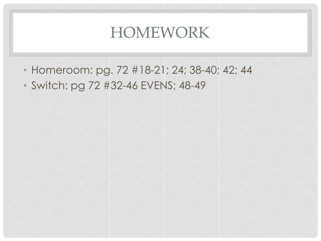Homework • Homeroom: pg. 72 #18-21; 24; 38-40; 42; 44 • Switch: pg 72 #32-46 EVENS; 48-49