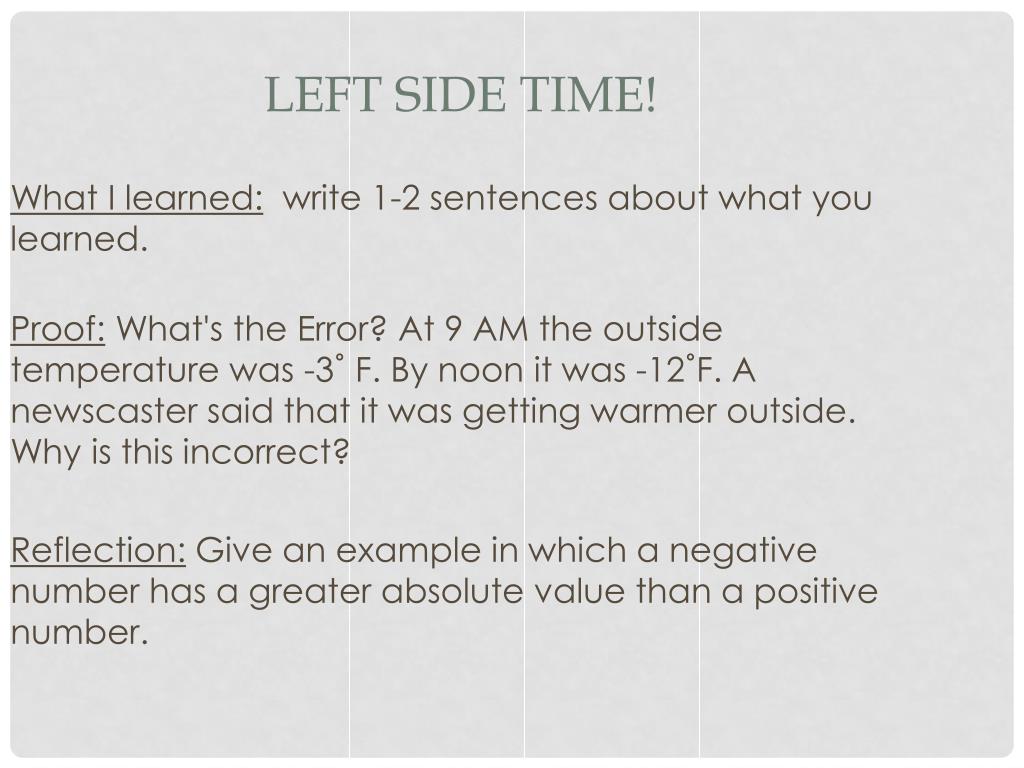 Left side time! What I learned: write 1-2 sentences about what you learned. Proof: What's the Error? At 9 AM the outside temperature was -3˚ F. By noon it was -12˚F. A newscaster said that it was getting warmer outside. Why is this incorrect? Reflection: Give an example in which a negative number has a greater absolute value than a positive number.