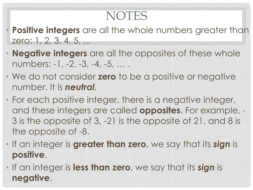 Notes • Positive integers are all the whole numbers greater than zero: 1, 2, 3, 4, 5, ... • Negative integers are all the opposites of these whole numbers: -1, -2, -3, -4, -5, … . • We do not consider zero to be a positive or negative number. It is neutral. • For each positive integer, there is a negative integer, and these integers are called opposites. For example, -3 is the opposite of 3, -21 is the opposite of 21, and 8 is the opposite of -8. • If an integer is greater than zero, we say that its signis positive. • If an integer is less than zero, we say that its signis negative.