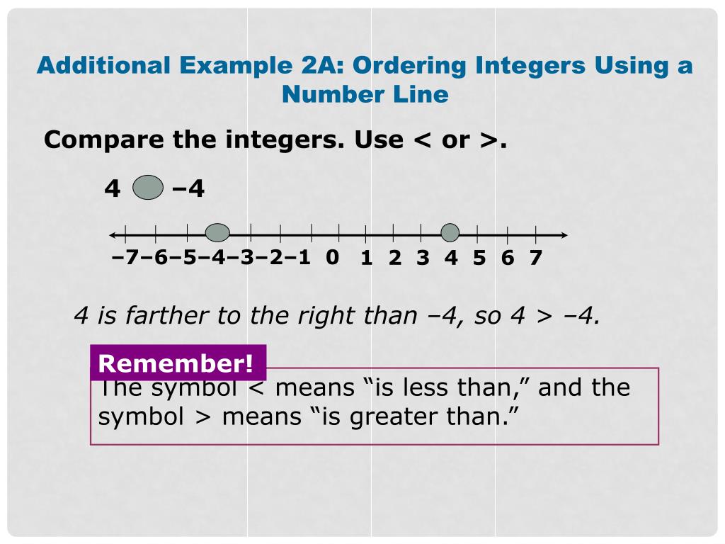 Remember! –7–6–5–4–3–2–1 0 1 2 3 4 5 6 7 The symbol < means “is less than,” and the symbol > means “is greater than.” Additional Example 2A: Ordering Integers Using a Number Line Compare the integers. Use < or >. 4 –4 4 is farther to the right than –4, so 4 > –4.
