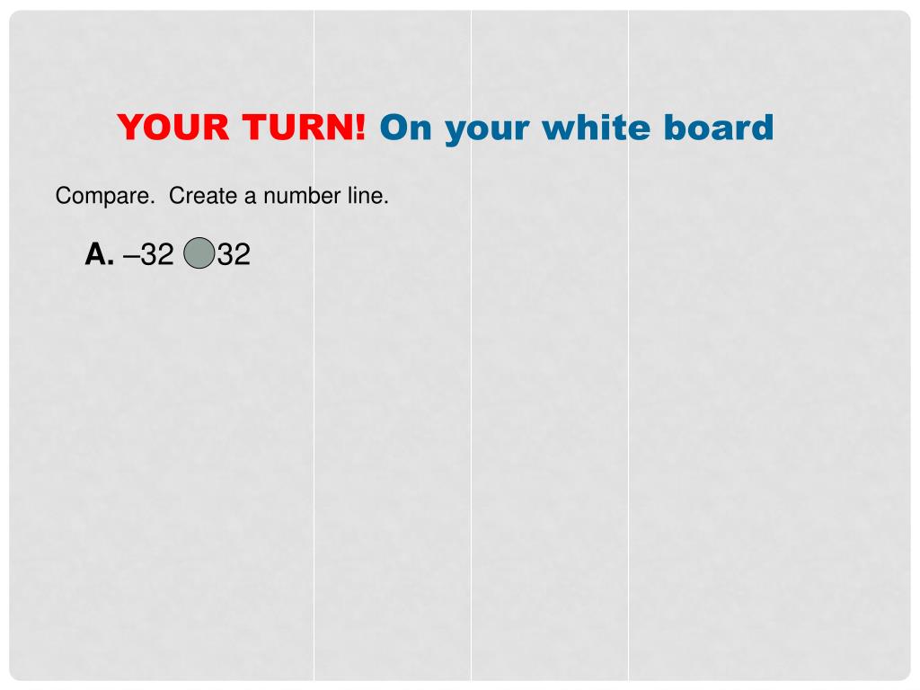 YOUR TURN! On your white board Compare. Create a number line. A. –32 32