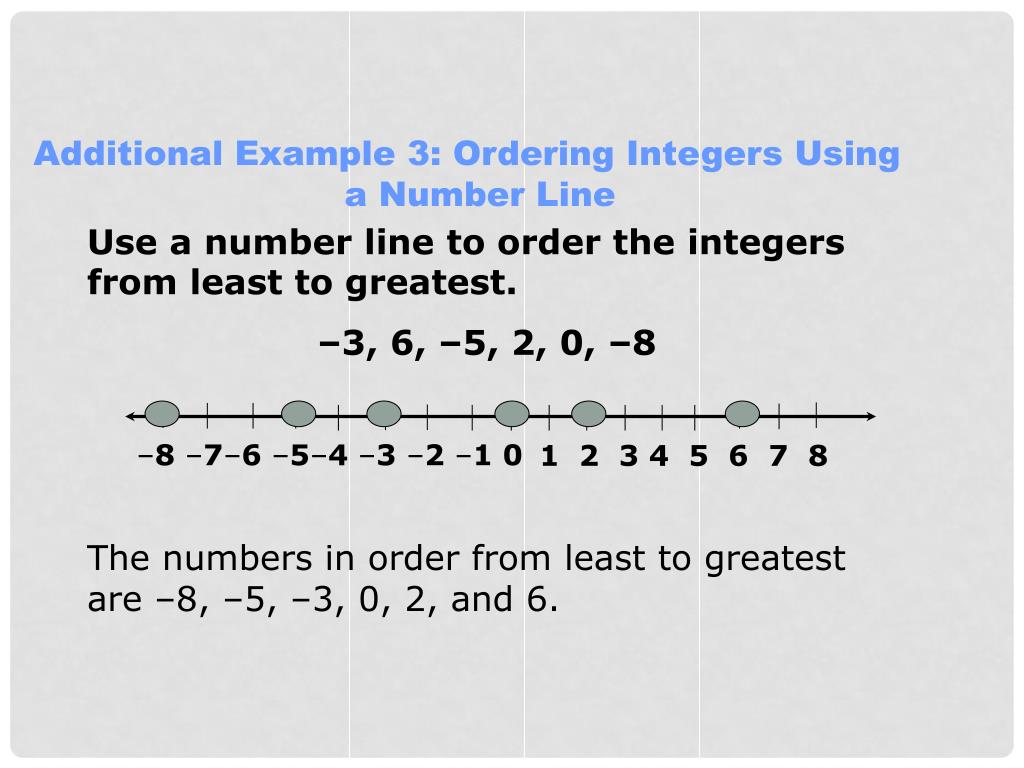 Additional Example 3: Ordering Integers Using a Number Line –8 –7–6 –5–4 –3 –2 –1 0 1 2 3 4 5 6 7 8 Use a number line to order the integers from least to greatest. –3, 6, –5, 2, 0, –8 The numbers in order from least to greatest are –8, –5, –3, 0, 2, and 6.