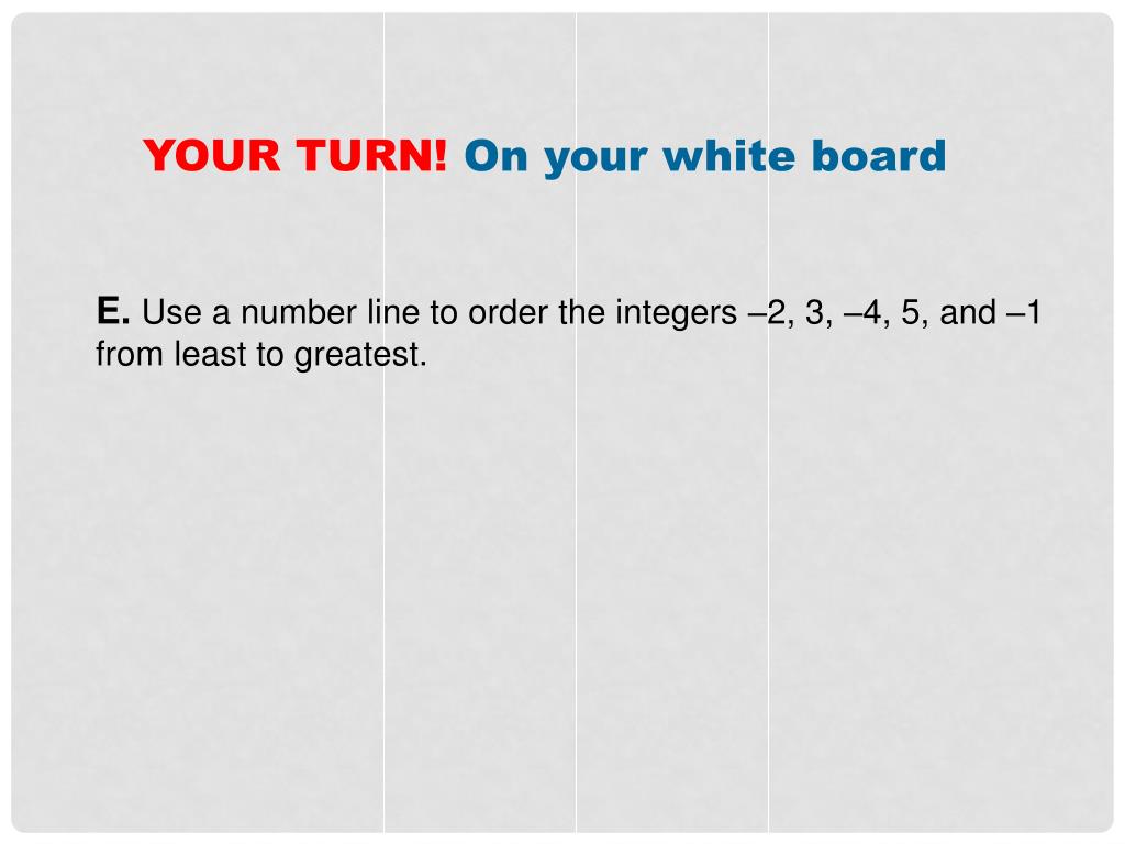 YOUR TURN! On your white board E. Use a number line to order the integers –2, 3, –4, 5, and –1 from least to greatest.