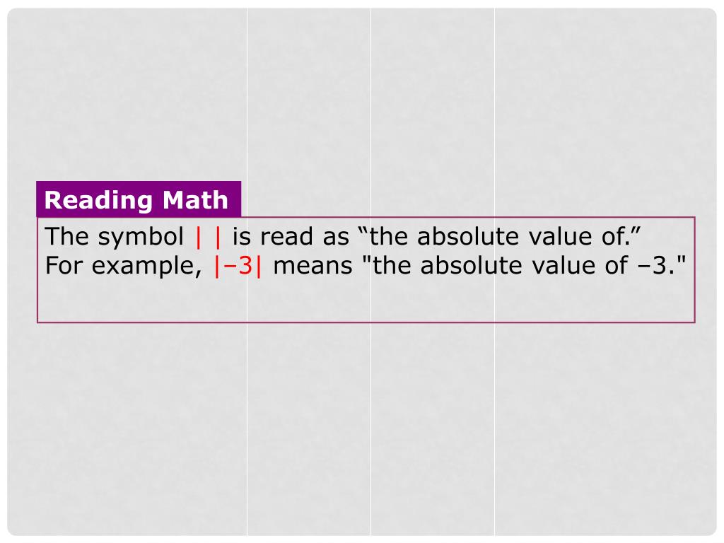 Reading Math The symbol | | is read as “the absolute value of.” For example, |–3| means "the absolute value of –3."