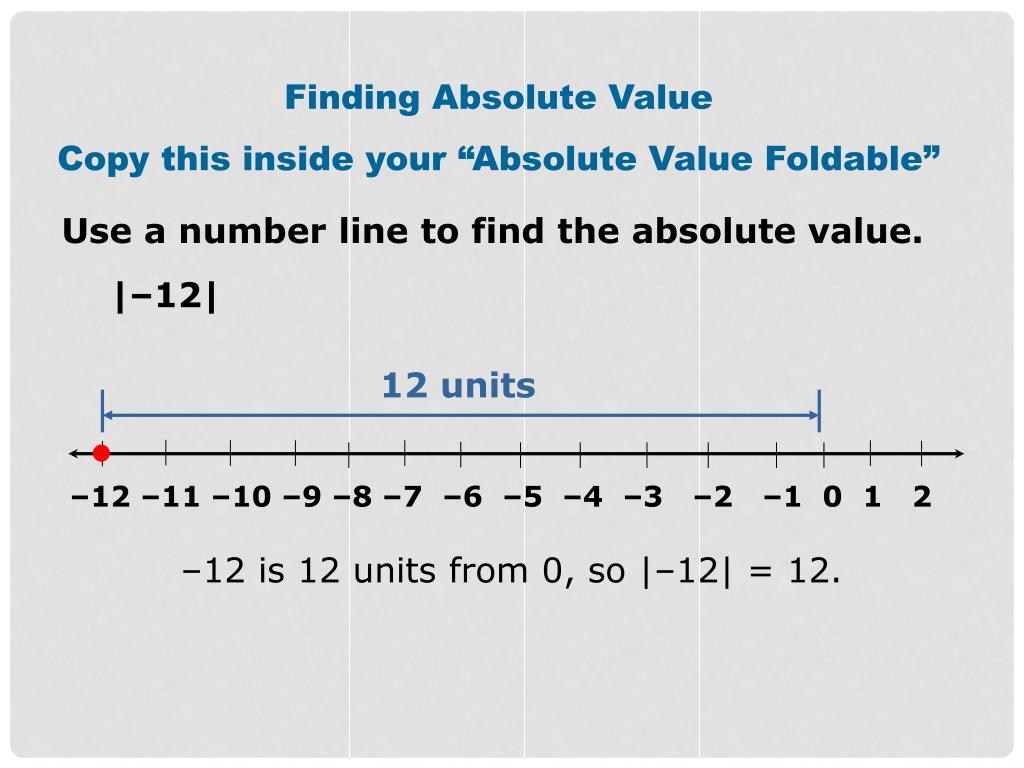 12 units –12 –11 –10 –9 –8 –7 –6 –5 –4 –3 –2 –1 0 1 2 Finding Absolute Value Copy this inside your “Absolute Value Foldable” Use a number line to find the absolute value. |–12| –12 is 12 units from 0, so |–12| = 12.