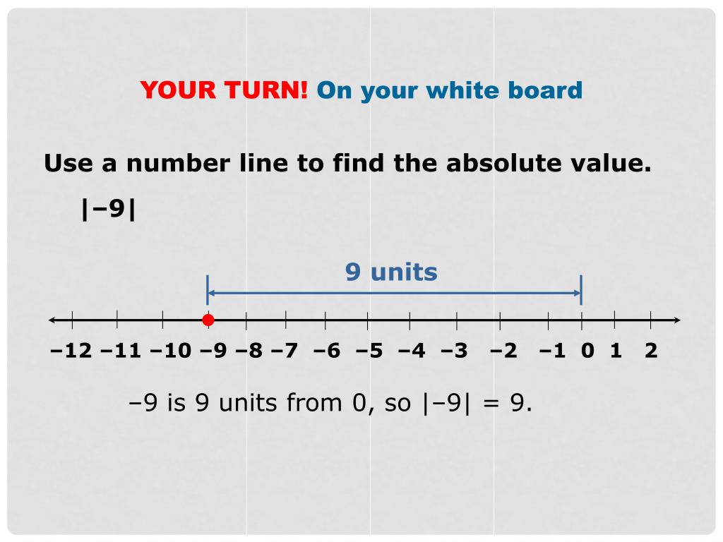 9 units –12 –11 –10 –9 –8 –7 –6 –5 –4 –3 –2 –1 0 1 2 YOUR TURN! On your white board Use a number line to find the absolute value. |–9| –9 is 9 units from 0, so |–9| = 9.