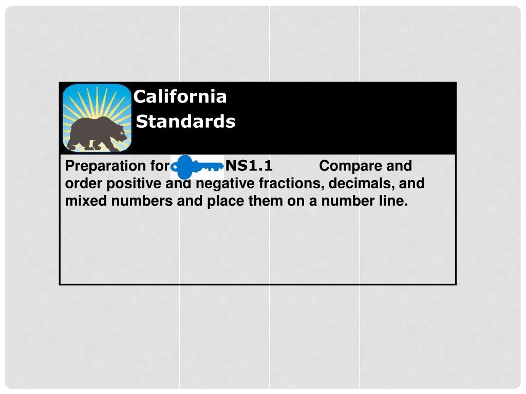 California Standards Preparation for NS1.1 Compare and order positive and negative fractions, decimals, and mixed numbers and place them on a number line.