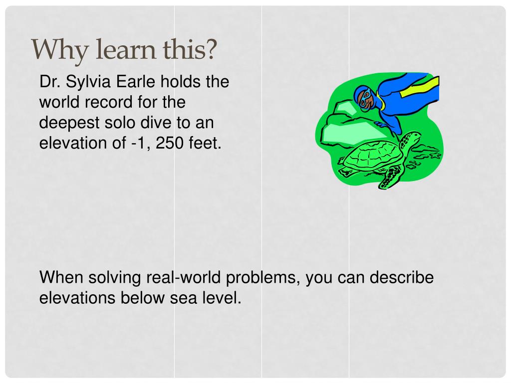 Why learn this? Dr. Sylvia Earle holds the world record for the deepest solo dive to an elevation of -1, 250 feet. When solving real-world problems, you can describe elevations below sea level.