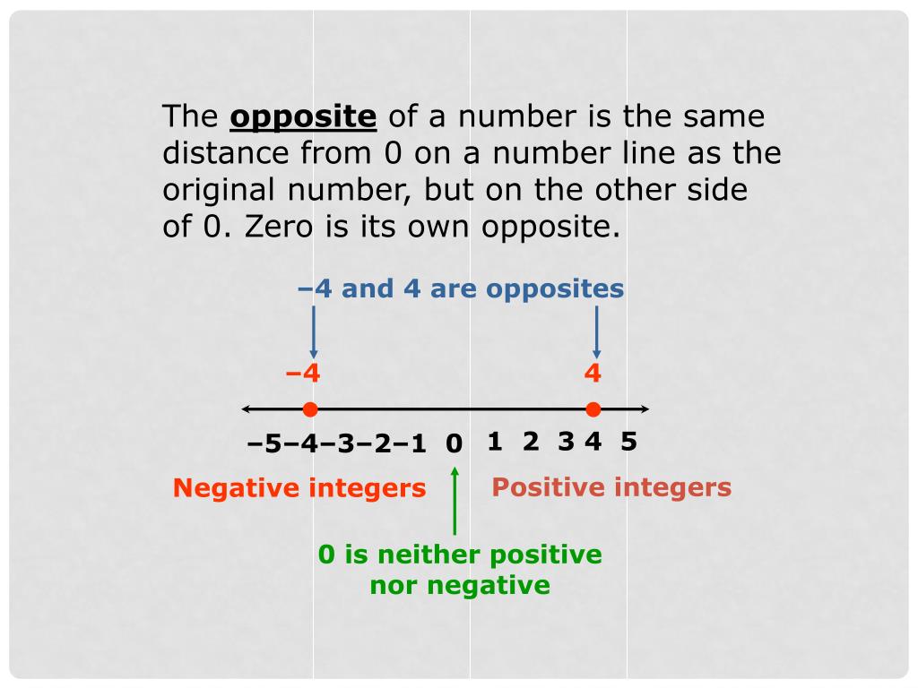 The opposite of a number is the same distance from 0 on a number line as the original number, but on the other side of 0. Zero is its own opposite. –4 and 4 are opposites –4 4 • • 1 2 3 4 5 –5–4–3–2–1 0 Positive integers Negative integers 0 is neither positive nor negative