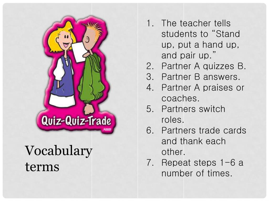 The teacher tells students to “Stand up, put a hand up, and pair up.” • Partner A quizzes B. • Partner B answers. • Partner A praises or coaches. • Partners switch roles. • Partners trade cards and thank each other. • Repeat steps 1-6 a number of times. Vocabulary terms