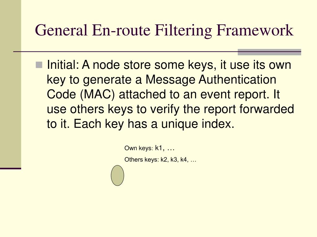 Own keys:k1, … Others keys: k2, k3, k4, … General En-route Filtering Framework • Initial: A node store some keys, it use its own key to generate a Message Authentication Code (MAC) attached to an event report. It use others keys to verify the report forwarded to it. Each key has a unique index.