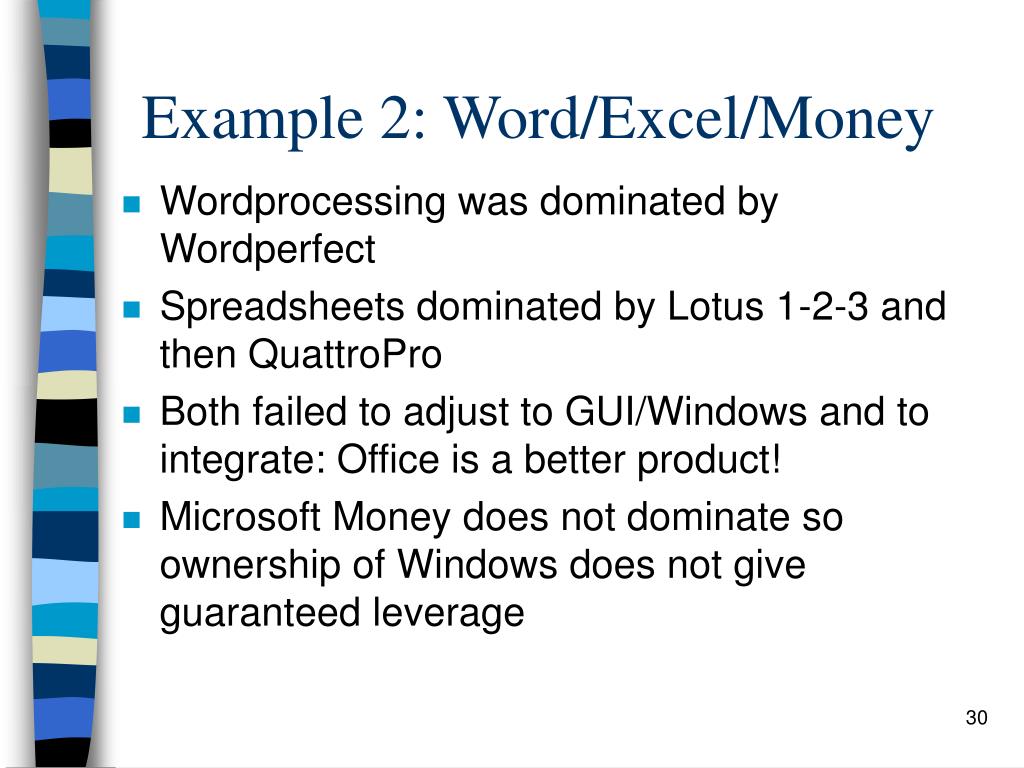 Example 2: Word/Excel/Money • Wordprocessing was dominated by Wordperfect • Spreadsheets dominated by Lotus 1-2-3 and then QuattroPro • Both failed to adjust to GUI/Windows and to integrate: Office is a better product! • Microsoft Money does not dominate so ownership of Windows does not give guaranteed leverage