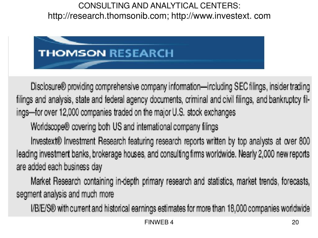 CONSULTING AND ANALYTICAL CENTERS:http://research.thomsonib.com FINWEB 4