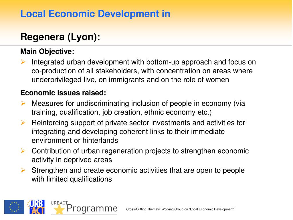 Local Economic Development in Regenera (Lyon): Main Objective: • Integrated urban development with bottom-up approach and focus on co-production of all stakeholders, with concentration on areas where underprivileged live, on immigrants and on the role of women Economic issues raised: • Measures for undiscriminating inclusion of people in economy (via training, qualification, job creation, ethnic economy etc.) • Reinforcing support of private sector investments and activities for integrating and developing coherent links to their immediate environment or hinterlands • Contribution of urban regeneration projects to strengthen economic activity in deprived areas • Strengthen and create economic activities that are open to people with limited qualifications