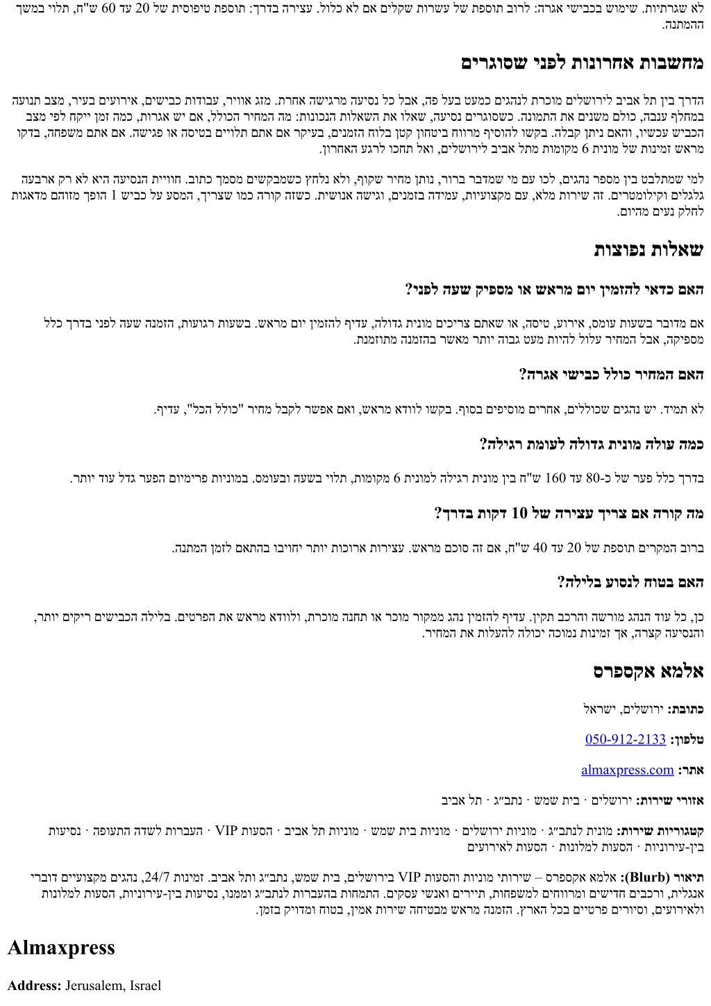Phone:+972 50-912-2133 Website:almaxpress.com Service Areas: Jerusalem · Beit Shemesh · Ben Gurion Airport · Tel Aviv Service Categories: Taxi to Ben Gurion Airport · Jerusalem Taxi · Beit Shemesh Taxi · Tel Aviv Taxi · VIP Transfers · Airport Transfers · Intercity Rides · Hotel Transfers · Event Transfers Blurb: ALMA Express provides premium taxi and VIP transfer services in Jerusalem, Beit Shemesh, Ben Gurion Airport, and Tel Aviv. Available 24/7 with professional English-speaking drivers and modern, spacious vehicles for families, tourists, and business travelers. We specialize in airport transfers, intercity rides, hotel and event transport, and private tours across Israel. Book in advance for reliable, safe, on-time service.