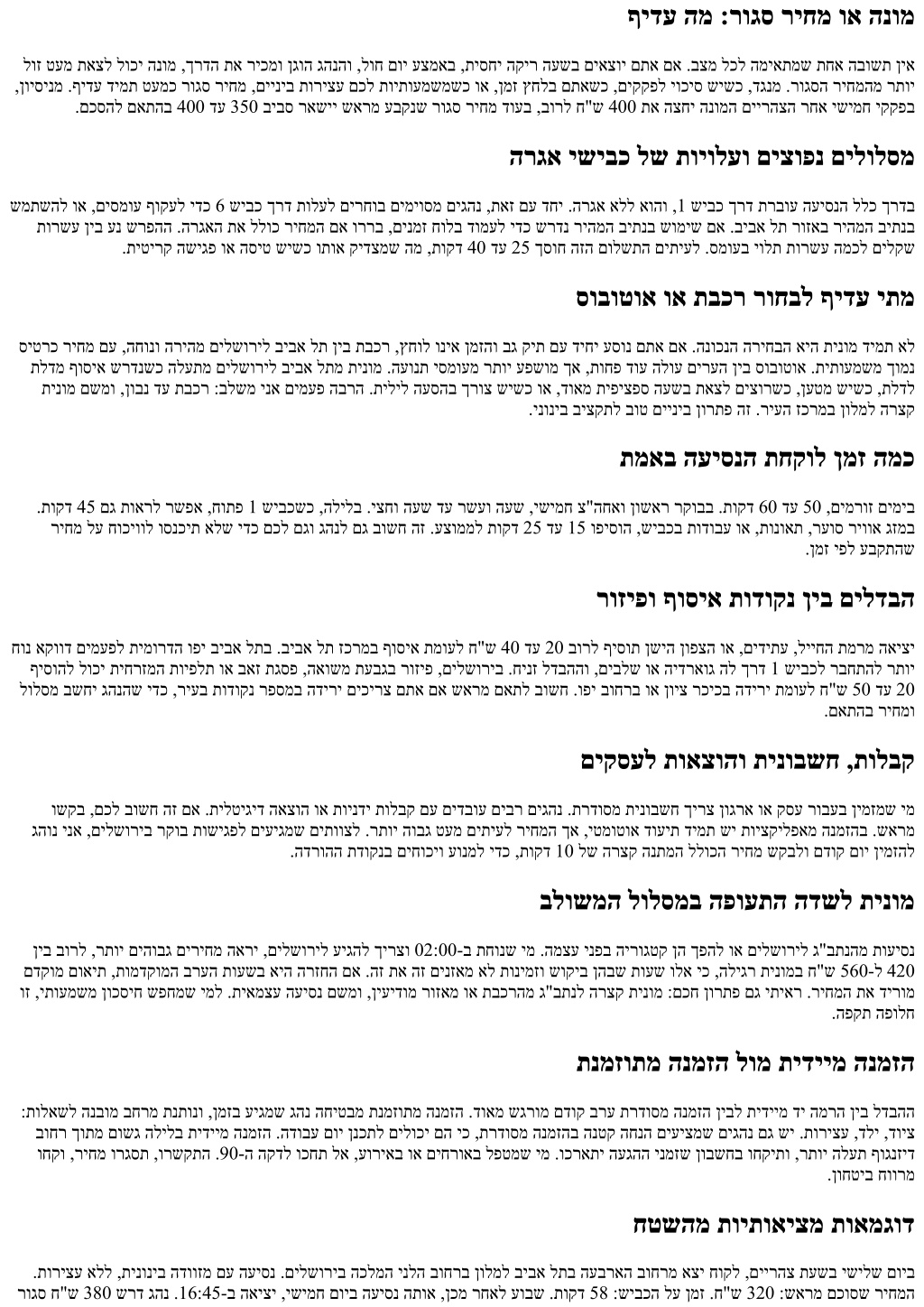 תולודגה םירעה יתש ןיב העיסנ לע םלשל ךירצ תמאב המכ ,הלשממה תודסומ ןיבל ביבא לת לש םייוליבהו קטייהה ,םיקסעה זכרמ ןיב רבחמש ריצה הז .תוינומ יפלא םוי ידמ תועסונ םילשוריל ביבא לת ןיב ,בכרה גוס ,סמוע ,העש יפל הנתשמ הבושתה לבא ,הטושפ תעמשנ םילשוריל ביבא לתמ תינומ הלוע המכ הלאשה .םילשורי לש תוברתהו הימדקאה תוגלוק ,תוחוקלל תועיבקב הזה וקה תא ןימזמש והשימכ .ריוואה גזמ יפל וליפאו ,תוחיטב אסיכ וא 6 שיבכ ומכ תופסות ,תקיודמ ףוסיא תדוקנ .הנומה לש םיימשר םיפירעתו ,םיגהנ םע תוחיש ,תויתימא תונמזה לע םיססובמש םירפסמ םע ,תינכדע בצמ תנומת ןאכ יתזכיר ,החפשמו ןופצהמ עסונש ימ .םילשורי זכרמ רוזאב הדיריו ביבא לת זכרמב האיצי תדוקנ ,תודחוימ תוריצע אלל הליגר העיסנל םיסחייתמ הבתכב םיחווטה .ריחמב הלק הייטס תוארל לוכי ,םילשורי זכרמל ץוחמ תונוכשל דרוי וא ,תוימורד תונוכשמ וא ןשיה לעופב ריחמה לע עיפשמ המ הביסה .שארמ םכסומ ריחמב תועבקנ הזה וקה לע תוינוריע ןיבה תועיסנה תיברמ לעופב ךא ,םייצרא םיפירעת יפל עבקנ לארשיב הנומה ףירעת :חטשב םתוא האור ינאש יפכ ,ןאכל וא ןאכל ריחמה תא םיטמש םיירקיעה םימרוגה הנה .ךלוה הז ןאל תעדל בושח עסונל םגו גהנל םג :הטושפ לש רקוב :העונת יסמוע .ליגר לוח םוי תמועל 25% דעו 10%-כ לש תפסותב בורל ,רתוי םירקי תויהל םיטונ גחו תבש ,הליל :העיסנה תעש םיגהנהו ,יצחו העשל ךופהל הלוכי ליגר םויב תוקד 50 לש העיסנ .ץחל תודוקנ םה גח יברעו ,ישימח לש םיירהצה רחא ,ןושאר ימי .רתוי הלעי יפ יא יו תינומ וא םוימירפ בכר .הלודג תינומ וא תומוקמ 6 תינומ תמועל הליגר תינומ :בכרה גוס .הזה ןוכיסה תא םירחמתמ הרגאה תא ושקבי םירחא ,ריחמב הז תא םיללוכ םיגהנהמ קלח .תפסות שי ,שדחמ 1 שיבכ וא 6 שיבכ ךרד עוסנל םירחוב םא :הרגא ישיבכ .םילקש תורשע המכ ףיסוהל םילוכי םלוכ ,דחוימב לודג ןעטמ ,קונית אסיכ ,הנתמה ןמז ,ףסונ ףוסיא ,ךרדב תוריצע :תודחוימ תושקב .דרפנב לשייפס תינומב םיילאיר םיריחמ יחווט ריחמב ,הליגר תינומל ח"ש 360 דע 280 לש חווט ללכ ךרדב לבקי ,תוחונ תועשב לוח םויב םילשוריל ביבא לתמ תינומ הלוע המכ לאושש ימ הנומהש ןיבהל בושח ,הנומ לע שקעתמ גהנה םא .ח"ש 420 דע 330-ל ללכ ךרדב הלוע חווטה ,גח וא תבש ,הליל ,ץחל תועשב .שארמ םכוסש .םירשעו העש לעמ תכשמנ העיסנהשכ רקיעב ,הליגר תינומב םג ח"ש 450 דע 380 לש תוינובשח יתיאר םיכורא םיקקפב .שיבכב ןמזהמ עפשומ ולבקת הרומתב לבא ,יטרפה גהנהמ רתוי הובג טעמ עובק ריחמ וארת ןהבש םימעפ שי ,םילודג םידקומ וא תויצקילפא ךרד שארמ ןימזמש ימל .שרפהה תא הווש הז ,דועית םיכירצש םיקסעל .הקסעה לע תידיימ הלבקו רדוסמ לוטיבל תורשפא ,רתוי ההובג תונימז תמלתשמ הלודג תינומ יתמ הדשב םינפ תלבק וא ,תודווזמ הברה םע םיעסונ ,םידלי םע החפשמ ,הצובקב רבודמשכ תשרדנ םילשוריל ביבא לתמ הלודג תינומ לש הנמזה את םע דחוימב לודג בכר .סמועבו העשב יולת ,ח"ש 520 דע 380 לש חווטב ללכ ךרדב תרחמותמ םילשוריל ביבא לתמ תומוקמ 6 תינומ .הפועתה תמועל יתועמשמ ןוכסיח תויהל הלוכי הלודג תינומ ,ריחמה תא םיקלחמש םיעסונ השימח וא העברא םתא םא .רתוי הלעי יתרקוי םגד וא לדגומ ןעטמ .הקיטסיגולל רתוי החונ םגו ,תוליגר תוינומ יתש היהי בורל דויצה לע שארמ העידי םעו ןוכנ בכר םע ןכומ עיגמש גהנ .תולודג תודווזמ וא ,םוליצ דויצ ,קונית תלגע שי םא שארמ גהנל ןייצל יאדכ .תופסותב עיתפי אל םגו רתוי בושק יפ יא יו תינומ לש לדבהה המ גהנ תויהל לוכי הז .םיטרפ לע הדפקהו תיטנגלא תודיינתה ,םיחוורמ םיבשומ ,טקש ףידעמש ימל םיאתמ םילשוריל ביבא לתמ יפ יא יו תינומ תוריש וא עוריאל הסינכ ירודיסב עויס םג םימעפלו ,תולולכ תורגא םע םיריהמ םישיבכ ךרד העיסנ ,םינימז הניעט ירוביח ,םימ יקובקב ,הפילחב עיגמש .ח"ש 800-ל םג עיגהל לוכי אוה םימח םידעומב וא ברעב ישיש ימיב רשאכ ,ח"ש 750-ל 500 ןיב בורל ענ הזכ תורישל ריחמה .ןולמ יבול ןורתיה .תמצמטצמ םיגהנה תונימז ןהבש תורחואמ תועשב רבודמשכ וא ,בוט ינושאר םשור ולבקיש יל בושחשכ ל"וחמ םיחרואל יפ יא יו ןימזמ ינא .תואדוו
