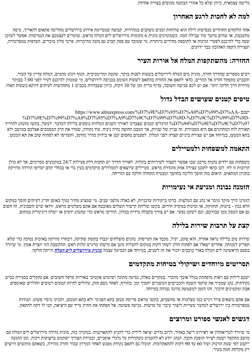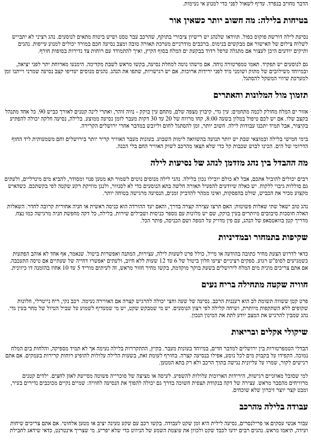תקיודמה הדוקנל תחטבואמ העגהו תוארנ רבודמ םא .תימשרה תבותכהמ הנוש איה בורל ,תקיודמה הסינכל רושיק גהנל וחלש .הלילב בטיה תונמוסמ דימת אל תוסינכה ,תונולמ ימחתמב םתעגהש םירשאמ םתאש דע הקד ראשיהל גהנהמ ושקב ךרוצה תדימב .תלדה עבצ רואית וא רעש דוק ומכ יוהיז ןמיס ושקב ,הריד וא רמיצב .תונטקה תועשב דחוימב ,תאז תושעל וחמשי םיגהנה בור .הנוכנה תבותכל הנמזה םירשאמש ינפל לואשל יאדכש תולאש םתא םא .רוחיאה תוינידמ המו ,הלוכתל םאתהב תודווזמל םוקמ שי םאה ,בוריקב רוצייה תנש ,עיגי בכר הזיא תעדל ושקב ,םירגוס םתאש ינפל אלו בשומה ןוויכל דקמל ןתינש תימינפ הרואת שי םא וקדב ,ךרדב הדובע םיננכתמ םתא םא .קזח םשבממ ענמיהל ןתינ םא ולאש ,תוחירל םישיגר .ךשמהב טקש חיטבמ אוהו ,תוקד שמחמ רתוי חקול אל הזה תויפיצה םואית .בכרה ראשל המרד ילב הרזחה םואית תחורא ןומזת םא .םוקימו העש םע הרצק רושיא תעדוה וחלש ,הרזחה ינפל ברע .שיגנ םוקמב הנמזהה יטרפ תא ורמש ,בושו ךולה םתנמזה םא תונורחא תוקד לש תויועט ענומ הז .תודווזמו ,םיעסונ רפסמ ,םוקמ ,העש :םירורב םירסמ םיפידעמ םייעוצקמ םיגהנ .םאתהב ונכדע ,זז ןולמב רקובה .הלילב ךראתהל תויושעש םירפסמב תוילכלכ תולעות תקולח םא .םיעסונ השיש דע השולש לש תוצובקל דחוימב ,תילנויצרה הריחבה תויהל הלוכי תינומ ,תוחיטבו תוחונ ,ןמז םיבשחמשכ ,רק טבמב תומוקמ 6 תינומב .ךכב ורחבי םיבר ,תירוביצ הרובחתב הפולחתו הנתמה לש העש תכסוח העיסנהו ,םדאל ח"ש 120 דע 80-ל העיגמ תולעה .ןעטמה את לע ץחל וא םידרפנ םיבכר ינש תנמזה וכסחת לבא ,בכרל רתוי הפיט ומלשת םיתיעל ,חלמה םיל םילשורימ רקוב אפס דעי ,םושג הליל :חטשהמ המגוד שיבכב קד םשג דרי .3:50-ב םילשוריב ףוסיא ונמאית ןורחאה עגרב .ג"בתנב רחואמ תחנ קקוב ןיעב 7:30-ב לופיט ןימזהש גוז ,םיפרוח המכ ינפל ונייה רבכ 5:40-ב .דיחא בצקב ונכשמהו ,הפאמ תצקו םימח םימל הרצק הריצע תדוקנל ונרבע ,טאל ונלחתה .תילאידיא התייה אל תוארהו ,1 .ןמזב םיעיגמ ויה אל ,םיאתמ בכרו םדקומ םואית אלל .ש"פוסה תא םהל ליצה הזש ורפיסו ,לופיטה ינפל תצקו העש ונשי םה .ןולמב םוימירפ תוינומ תובלתשמ הפיא יו תינומ .שערלו תודונתל דחוימב שיגר והשימשכ וא ,תיגוז הגיגח ,ל"וחמ חרוא םע תיקסע העיסנ :ומצע תא קידצמ םוימירפ בכר םהבש םיעגר שי תוכרה ,הליל לש תופייע םייניעב .םייניעל תיתודידי הרואתו בידנ םייכרב חוורמ ,םיררוואמ םיבשומ ללכ ךרדב העיצמ חלמה םיל םילשורימ יפ יא .לוקשל יאדכש טרפ הז ,בושח םכלש עוריאה םא .בוט השיגרמ וזה האיצי ינפל המכח הנכה לע רומשל ידכ גהנה תא ונכדע ,רוריק תוכירצש תופורת םכל שי םא .םיכמסמו תובכש שובל ,םישיגנ םימ ,ןועט ןופלט וקדב ,האיציה ינפל העש יצח ,הלילב לבא ,ילאיווירט עמשנ הז .ןולמל תוסינכל תופולח םכל ומשרו ,הפמ התוא לע גהנהו םתאש אדוול ידכ דעיל טווינ ורידגה .אתב הללצה .תונטק תויועט ךסוח םדקומ ןונכת ,תופייע םייניעהשכ םיריכמ אל םתאש םיקפסל תוכיא תקידב תונכומ :ינשה .תסמונמו הרורב תרושקת :ןושארה .םינמיס ינש דוע שי לבא ,חוטיב םוליצו ירוביצ ןוישיר שקבל רשפא ,שדח רפסממ םינימזמשכ .תוירחא לע הדיעמ וזה תופיקשה .תויהל לוכי אוה שימג המכו ,ירחא וא ינפל העיסנ ול שי םא תונכב דיגי בוט גהנ .ץחליהל ילב תולאש לע תונעל םייתביבס םילוקיש םיידירביה בכר ילכ ,הליל תועיסנב .הזכ בכר ושקב ,לגר תעיבט תיחפהל םכל בושח םא .םיילמשח וא םיידירביה בכר ילכל םירבוע םיגהנ רתוי תאו העיסנה חווט תא בטיה ריכמ גהנה םא אלא ,אלמ ילמשח לע ידירביה ףידע ,הניעט תודמע אלל ךורא עטקב רבודמ םא .רתוי םימיענ םיטקש .ךרדב הניעטה תונחת תוצופנ תולאש
