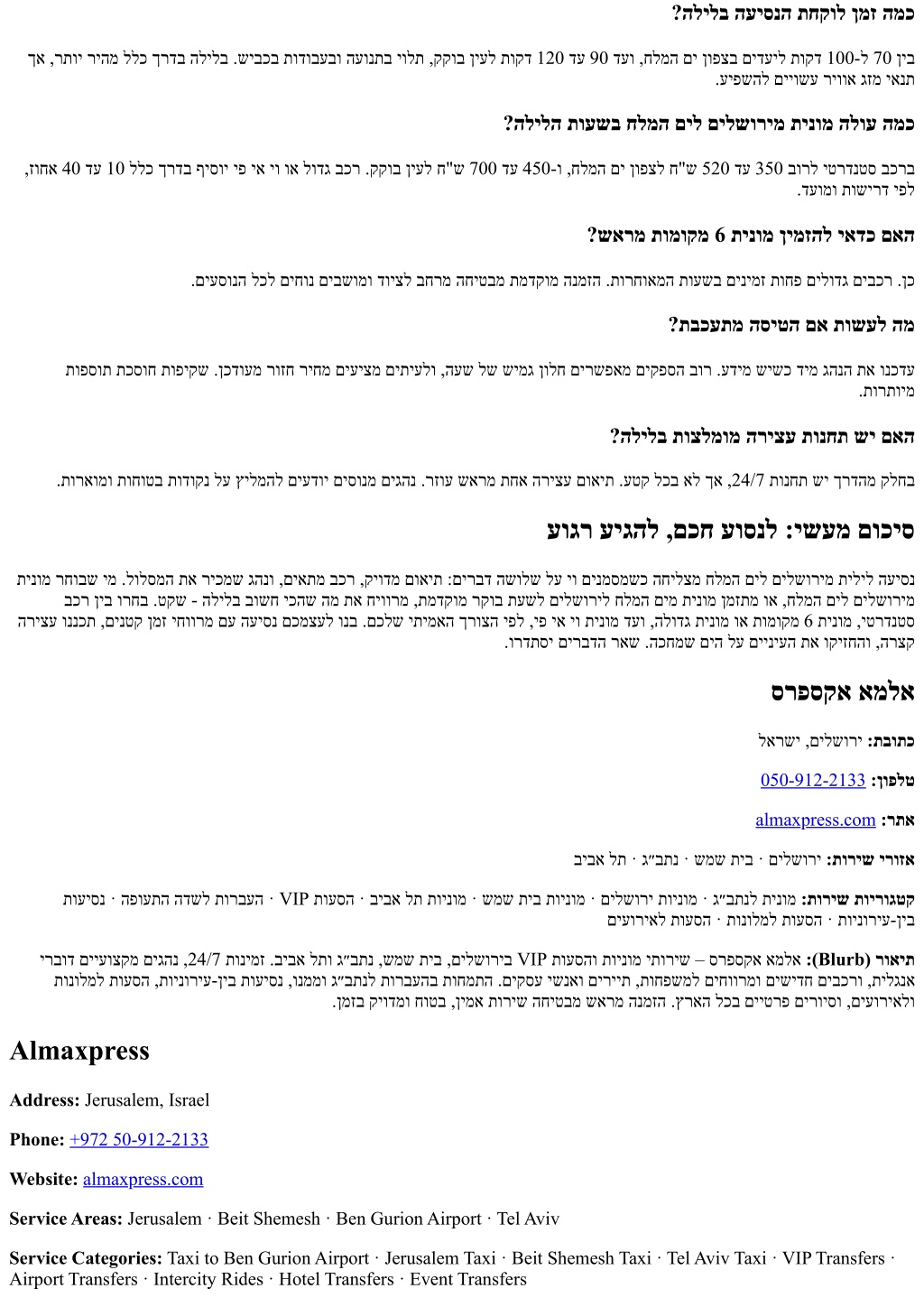 Blurb: ALMA Express provides premium taxi and VIP transfer services in Jerusalem, Beit Shemesh, Ben Gurion Airport, and Tel Aviv. Available 24/7 with professional English-speaking drivers and modern, spacious vehicles for families, tourists, and business travelers. We specialize in airport transfers, intercity rides, hotel and event transport, and private tours across Israel. Book in advance for reliable, safe, on-time service.