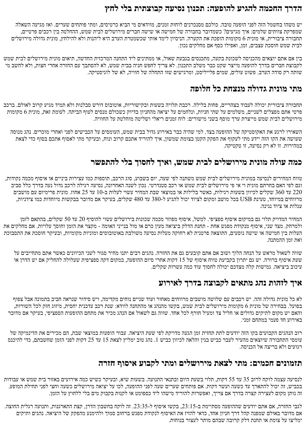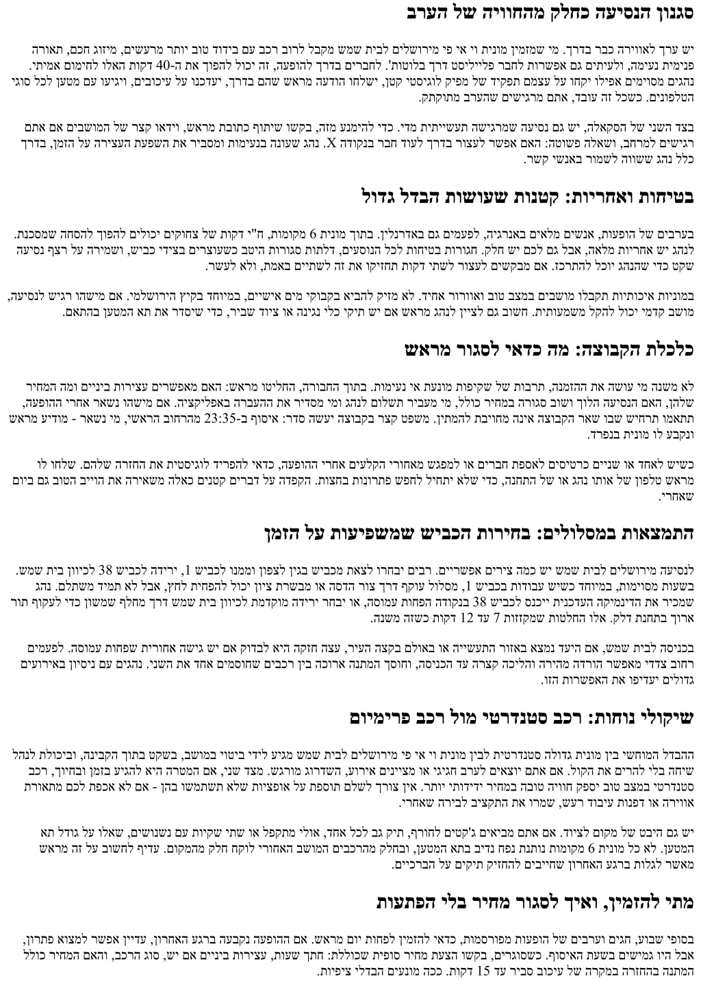 ברעה לש היווחהמ קלחכ העיסנה ןונגס הרואת ,םכח גוזימ ,םישערמ רתוי בוט דודיב םע בכר בורל לבקמ שמש תיבל םילשורימ יפ יא יו תינומ ןימזמש ימ .ךרדב רבכ הריוואל ךרע שי .יתימא םומיחל ולאה תוקד 40-ה תא ךופהל לוכי הז ,העפוהל ךרדב םירבחל .'תוטולב ךרד טסיליילפ רבחל תורשפא םג םיתיעלו ,המיענ תימינפ יגוס לכל ןעטמ םע ועיגיו ,םיבוכיע לע ונכדעי ,ךרדב םהש שארמ העדוה וחלשי ,ןטק יטסיגול קיפמ לש דיקפת םמצע לע וחקי וליפא םימיוסמ םיגהנ .קתקותמ ברעהש םישיגרמ םתא ,דבוע הז לכשכ .םינופלטה םתא םא םיבשומה לש רצק ואדיו ,שארמ תבותכ ףותיש ושקב ,הזמ ענמיהל ידכ .ידמ תיתיישעת השיגרמש העיסנ םג שי ,הלאקסה לש ינשה דצב ךרדב ,ןמזה לע הריצעה תעפשה תא ריבסמו תומיענב הנועש גהנ .X הדוקנב רבח דועל ךרדב רוצעל רשפא םאה :הטושפ הלאשו ,בחרמל םישיגר .רשק ישנאב רומשל הוושש גהנ ללכ לודג לדבה תושועש תונטק :תוירחאו תוחיטב .תנכסמש החסהל ךופהל םילוכי םיקוחצ לש תוקד י"ח ,תומוקמ 6 תינומ ךותב .ןילנרדאב םג םימעפל ,היגרנאב םיאלמ םישנא ,תועפוה לש םיברעב העיסנ ףצר לע הרימשו ,שיבכ ידיצב םירצועשכ בטיה תורוגס תותלד ,םיעסונה לכל תוחיטב תורוגח .קלח שי םכל םג לבא ,האלמ תוירחא שי גהנל .רשעל אלו ,תמאב םייתשל הז תא וקיזחת תוקד יתשל רוצעל םישקבמ םא .זכרתהל לכוי גהנהש ידכ טקש ,העיסנל שיגר והשימ םא .ימלשוריה ץיקב דחוימב ,םיישיא םימ יקובקב איבהל קיזמ אל .דיחא רורוואו בוט בצמב םיבשומ ולבקת תויתוכיא תוינומב .םאתהב ןעטמה את תא רדסיש ידכ ,ריבש דויצ וא הניגנ ילכ יקית שי םא שארמ גהנל ןייצל םג בושח .תיתועמשמ לקהל לוכי ימדק בשומ שארמ רוגסל יאדכ המ :הצובקה תלכלכ ריחמה המו םייניב תוריצע םירשפאמ םאה :שארמ וטילחה ,הרובחה ךותב .תומיענ יא תענומ תופיקש לש תוברת ,הנמזהה תא השוע ימ הנשמ אל ,העפוהה ירחא ראשנ והשימ םא .היצקילפאב הרבעהה תא רידסמ ימו גהנל םולשת ריבעמ ימ ,ללוכ ריחמב הרוגס בושו ךולה העיסנה םאה ,ןהלש שארמ עידומ - ראשנ ימ ,ישארה בוחרהמ 23:35-ב ףוסיא :רדס השעי הצובקב רצק טפשמ .ןיתמהל תביוחמ הניא הצובקה ראש ובש שיחרת ומאתת .דרפנב תינומ ול עבקנו ול וחלש .םהלש הרזחה תא תיטסיגול דירפהל יאדכ ,העפוהה ירחא םיעלקה ירוחאמ שגפמל וא םירבח תפסאל םיסיטרכ םיינש וא דחאל שישכ םויב םג בוטה בייוה תא הריאשמ הלאכ םינטק םירבד לע הדפקה .תוצחב תונורתפ שפחל ליחתי אלש ידכ ,הנחתה לש וא גהנ ותוא לש ןופלט שארמ .ירחאש ןמזה לע תועיפשמש שיבכה תוריחב :םילולסמב תואצמתה .שמש תיב ןוויכל 38 שיבכל הדירי ,1 שיבכל ונממו ןופצל ןיגב שיבכמ תאצל ורחבי םיבר .םיירשפא םיריצ המכ שי שמש תיבל םילשורימ העיסנל גהנ .םלתשמ דימת אל לבא ,ץחל תיחפהל לוכי ןויצ תרשבמ וא הסדה רוצ ךרד ףקוע לולסמ ,1 שיבכב תודובע שישכ דחוימב ,תומיוסמ תועשב רות ףוקעל ידכ ןושמש ףלחמ ךרד שמש תיב ןוויכל תמדקומ הדירי רחבי וא ,הסומע תוחפה הדוקנב 38 שיבכל סנכיי תינכדעה הקימנידה תא ריכמש .הנשמ הזשכ תוקד 12 דע 7 תוזזקמש תוטלחה ולא .קלד תנחתב ךורא םימעפל .הסומע תוחפש תירוחא השיג שי םא קודבל איה הקזח הצע ,ריעה הצקב םלואב וא היישעתה רוזאב אצמנ דעיה םא ,שמש תיבל הסינכב םיעוריאב ןויסינ םע םיגהנ .ינשה תא דחא םימסוחש םיבכר ןיב הכורא הנתמה ךסוחו ,הסינכה דע הרצק הכילהו הריהמ הדרוה רשפאמ ידדצ בוחר .וזה תורשפאה תא ופידעי םילודג םוימירפ בכר לומ יטרדנטס בכר :תוחונ ילוקיש להנל תלוכיבו ,הניבקה ךותב טקשב ,בשומב יוטיב ידיל עיגמ שמש תיבל םילשורימ יפ יא יו תינומ ןיבל תיטרדנטס הלודג תינומ ןיב ישחומה לדבהה בכר ,ךויחבו ןמזב עיגהל איה הרטמה םא ,ינש דצמ .שגרומ גורדשה ,עוריא םינייצמ וא יגיגח ברעל םיאצוי םתא םא .לוקה תא םירהל ילב החיש תרואתמ םכל תפכא אל םא - ןהב ושמתשת אלש תויצפוא לע תפסות םלשל ךרוצ ןיא .רתוי יתודידי ריחמב הבוט היווח קפסי בוט בצמב יטרדנטס .ירחאש הריבל ביצקתה תא ורמש ,שער דוביע תונפד וא הריווא את לדוג לע ולאש ,םישונשנ םע תויקש יתש וא לפקתמ ילוא ,דחא לכל בג קית ,ףרוחל םיטק'ג םיאיבמ םתא םא 