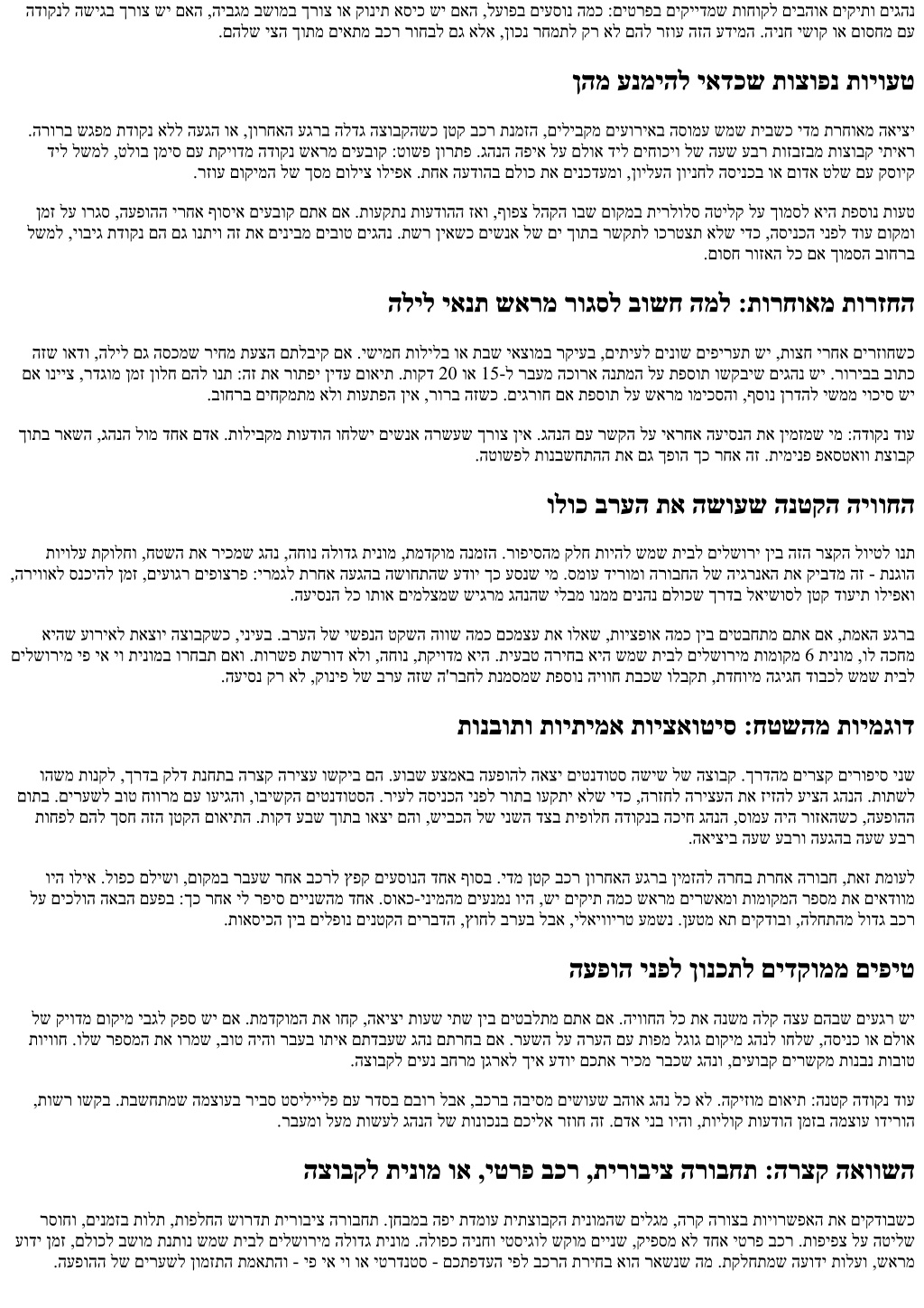 הדוקנל השיגב ךרוצ שי םאה ,היבגמ בשומב ךרוצ וא קונית אסיכ שי םאה ,לעופב םיעסונ המכ :םיטרפב םיקיידמש תוחוקל םיבהוא םיקיתו םיגהנ .םהלש יצה ךותמ םיאתמ בכר רוחבל םג אלא ,ןוכנ רחמתל קר אל םהל רזוע הזה עדימה .הינח ישוק וא םוסחמ םע ןהמ ענמיהל יאדכש תוצופנ תויועט .הרורב שגפמ תדוקנ אלל העגה וא ,ןורחאה עגרב הלדג הצובקהשכ ןטק בכר תנמזה ,םיליבקמ םיעוריאב הסומע שמש תיבשכ ידמ תרחואמ האיצי דיל לשמל ,טלוב ןמיס םע תקיודמ הדוקנ שארמ םיעבוק :טושפ ןורתפ .גהנה הפיא לע םלוא דיל םיחוכיו לש העש עבר תוזבזבמ תוצובק יתיאר .רזוע םוקימה לש ךסמ םוליצ וליפא .תחא העדוהב םלוכ תא םינכדעמו ,ןוילעה ןוינחל הסינכב וא םודא טלש םע קסויק ןמז לע ורגס ,העפוהה ירחא ףוסיא םיעבוק םתא םא .תועקתנ תועדוהה זאו ,ףופצ להקה ובש םוקמב תירלולס הטילק לע ךומסל איה תפסונ תועט לשמל ,יוביג תדוקנ םה םג ונתיו הז תא םיניבמ םיבוט םיגהנ .תשר ןיאשכ םישנא לש םי ךותב רשקתל וכרטצת אלש ידכ ,הסינכה ינפל דוע םוקמו .םוסח רוזאה לכ םא ךומסה בוחרב הליל יאנת שארמ רוגסל בושח המל :תורחואמ תורזחה הזש ואדו ,הליל םג הסכמש ריחמ תעצה םתלביק םא .ישימח תולילב וא תבש יאצומב רקיעב ,םיתיעל םינוש םיפירעת שי ,תוצח ירחא םירזוחשכ םא ונייצ ,רדגומ ןמז ןולח םהל ונת :הז תא רותפי ןידע םואית .תוקד 20 וא 15-ל רבעמ הכורא הנתמה לע תפסות ושקביש םיגהנ שי .רוריבב בותכ .בוחרב םיחקמתמ אלו תועתפה ןיא ,רורב הזשכ .םיגרוח םא תפסות לע שארמ ומיכסהו ,ףסונ ןרדהל ישממ יוכיס שי ךותב ראשה ,גהנה לומ דחא םדא .תוליבקמ תועדוה וחלשי םישנא הרשעש ךרוצ ןיא .גהנה םע רשקה לע יארחא העיסנה תא ןימזמש ימ :הדוקנ דוע .הטושפל תונבשחתהה תא םג ךפוה ךכ רחא הז .תימינפ פאסטאוו תצובק ולוכ ברעה תא השועש הנטקה היווחה תויולע תקולחו ,חטשה תא ריכמש גהנ ,החונ הלודג תינומ ,תמדקומ הנמזה .רופיסהמ קלח תויהל שמש תיבל םילשורי ןיב הזה רצקה לויטל ונת ,הריוואל סנכיהל ןמז ,םיעוגר םיפוצרפ :ירמגל תרחא העגהב השוחתהש עדוי ךכ עסנש ימ .סמוע דירומו הרובחה לש היגרנאה תא קיבדמ הז - תנגוה .העיסנה לכ ותוא םימלצמש שיגרמ גהנהש ילבמ ונממ םינהנ םלוכש ךרדב לאישוסל ןטק דועית וליפאו איהש עוריאל תאצוי הצובקשכ ,יניעב .ברעה לש ישפנה טקשה הווש המכ םכמצע תא ולאש ,תויצפוא המכ ןיב םיטבחתמ םתא םא ,תמאה עגרב םילשורימ יפ יא יו תינומב ורחבת םאו .תורשפ תשרוד אלו ,החונ ,תקיודמ איה .תיעבט הריחב איה שמש תיבל םילשורימ תומוקמ 6 תינומ ,ול הכחמ .העיסנ קר אל ,קוניפ לש ברע הזש ה'רבחל תנמסמש תפסונ היווח תבכש ולבקת ,תדחוימ הגיגח דובכל שמש תיבל תונבותו תויתימא תויצאוטיס :חטשהמ תוימגוד והשמ תונקל ,ךרדב קלד תנחתב הרצק הריצע ושקיב םה .עובש עצמאב העפוהל האצי םיטנדוטס השיש לש הצובק .ךרדהמ םירצק םירופיס ינש םותב .םירעשל בוט חוורמ םע ועיגהו ,ובישקה םיטנדוטסה .ריעל הסינכה ינפל רותב ועקתי אלש ידכ ,הרזחל הריצעה תא זיזהל עיצה גהנה .תותשל תוחפל םהל ךסח הזה ןטקה םואיתה .תוקד עבש ךותב ואצי םהו ,שיבכה לש ינשה דצב תיפולח הדוקנב הכיח גהנה ,סומע היה רוזאהשכ ,העפוהה .האיציב העש עברו העגהב העש עבר ויה וליא .לופכ םלישו ,םוקמב רבעש רחא בכרל ץפק םיעסונה דחא ףוסב .ידמ ןטק בכר ןורחאה עגרב ןימזהל הרחב תרחא הרובח ,תאז תמועל לע םיכלוה האבה םעפב :ךכ רחא יל רפיס םיינשהמ דחא .סואכ-ינימהמ םיענמנ ויה ,שי םיקית המכ שארמ םירשאמו תומוקמה רפסמ תא םיאדוומ .תואסיכה ןיב םילפונ םינטקה םירבדה ,ץוחל ברעב לבא ,ילאיווירט עמשנ .ןעטמ את םיקדובו ,הלחתהמ לודג בכר העפוה ינפל ןונכתל םידקוממ םיפיט לש קיודמ םוקימ יבגל קפס שי םא .תמדקומה תא וחק ,האיצי תועש יתש ןיב םיטבלתמ םתא םא .היווחה לכ תא הנשמ הלק הצע םהבש םיעגר שי תויווח .ולש רפסמה תא ורמש ,בוט היהו רבעב ותיא םתדבעש גהנ םתרחב םא .רעשה לע הרעה םע תופמ לגוג םוקימ גהנל וחלש ,הסינכ וא םלוא .הצובקל םיענ בחרמ ןגראל ךיא עדוי םכתא ריכמ רבכש גהנו ,םיעובק םירשקמ תונבנ תובוט ,תושר ושקב .תבשחתמש המצועב ריבס
