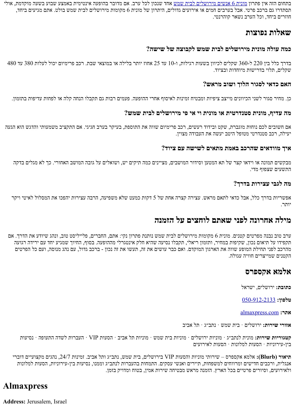 Phone:+972 50-912-2133 Website:almaxpress.com Service Areas: Jerusalem · Beit Shemesh · Ben Gurion Airport · Tel Aviv Service Categories: Taxi to Ben Gurion Airport · Jerusalem Taxi · Beit Shemesh Taxi · Tel Aviv Taxi · VIP Transfers · Airport Transfers · Intercity Rides · Hotel Transfers · Event Transfers Blurb: ALMA Express provides premium taxi and VIP transfer services in Jerusalem, Beit Shemesh, Ben Gurion Airport, and Tel Aviv. Available 24/7 with professional English-speaking drivers and modern, spacious vehicles for families, tourists, and business travelers. We specialize in airport transfers, intercity rides, hotel and event transport, and private tours across Israel. Book in advance for reliable, safe, on-time service.