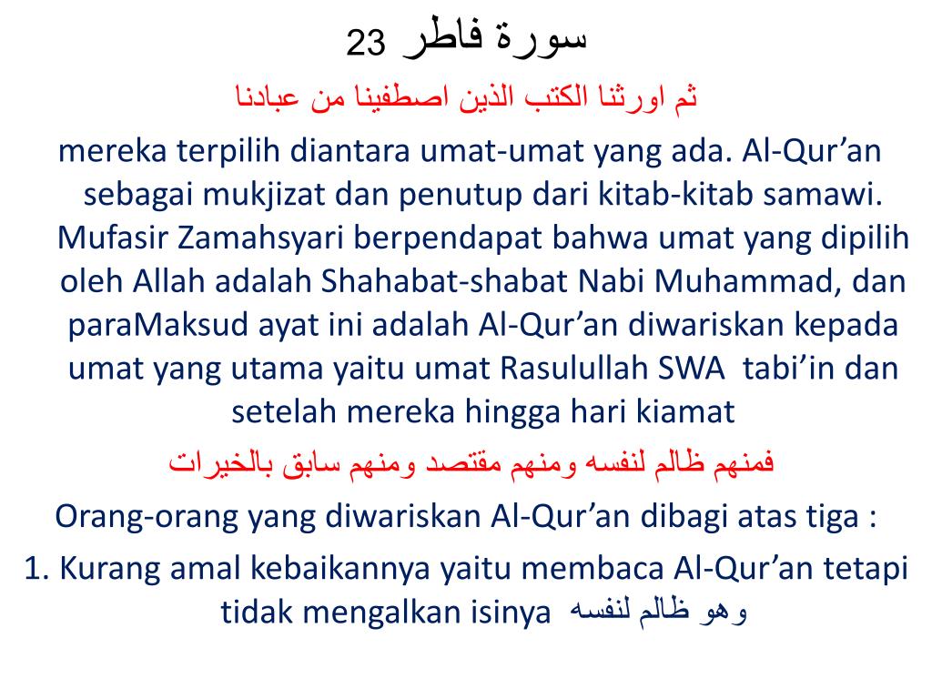 سورة فاطر 23 ثم اورثنا الكتب الذين اصطفينا من عبادنا mereka terpilih diantara umat-umat yang ada. Al-Qur’an sebagai mukjizat dan penutup dari kitab-kitab samawi. Mufasir Zamahsyari berpendapat bahwa umat yang dipilih oleh Allah adalah Shahabat-shabat Nabi Muhammad, dan paraMaksud ayat ini adalah Al-Qur’an diwariskan kepada umat yang utama yaitu umat Rasulullah SWA tabi’in dan setelah mereka hingga hari kiamat فمنهم ظالم لنفسه ومنهم مقتصد ومنهم سابق بالخيرات Orang-orang yang diwariskan Al-Qur’an dibagi atas tiga : 1. Kurang amal kebaikannya yaitu membaca Al-Qur’an tetapi tidak mengalkan isinya وهو ظالم لنفسه