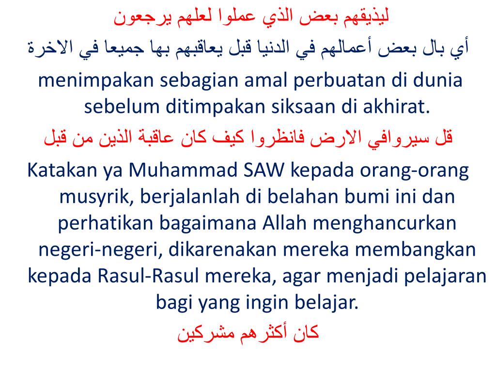 ليذيقهم بعض الذي عملوا لعلهم يرجعون أي بال بعض أعمالهم في الدنيا قبل يعاقبهم بها جميعا في الاخرة menimpakan sebagian amal perbuatan di dunia sebelum ditimpakan siksaan di akhirat. قل سيروافي الارض فانظروا كيف كان عاقبة الذين من قبل Katakan ya Muhammad SAW kepada orang-orang musyrik, berjalanlah di belahan bumi ini dan perhatikan bagaimana Allah menghancurkan negeri-negeri, dikarenakan mereka membangkan kepada Rasul-Rasul mereka, agar menjadi pelajaran bagi yang ingin belajar. كان أكثرهم مشركين