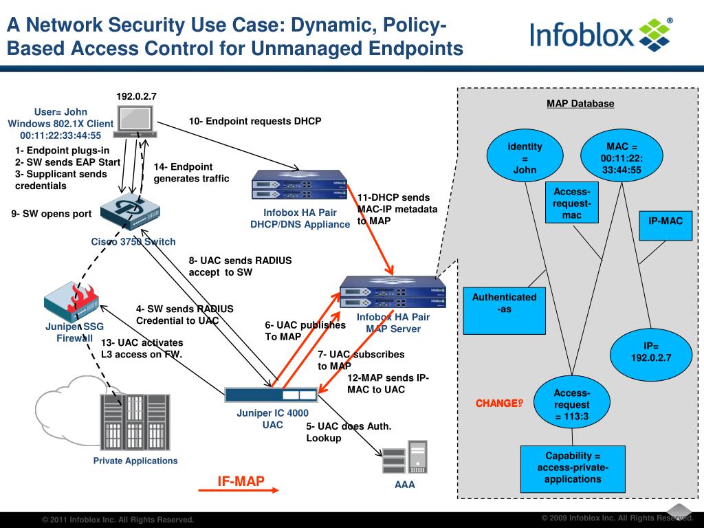 Use Case – Integrated Network / Physical Security Solution Secure Zone 1 Zone 2 MAP Database Juniper IC 4000 UAC Appliance location = Zone 2 location = Zone 1 Hirsch System (Physical Sensor) authenticated identity = John Publish: John in Zone 1 Access Request Publish: John in Zone 2 Infoblox MAP Server Cisco 3750 Switch CHANGE? CHANGE! Grants Access Request Publish: John is Authenticated; Session ID 113:3 Subscribe: Changes to Session 113:3 Policy Violation: Access Cut Off Access-request = 113:3 Juniper SSG Firewall Subscription Update: John in Zone 2 Publish (delete): John is Authenticated Classified Network 11- UAC updates firewall policy to block access 10- MAP updates UAC about the location change 9- Card reader publishes the update to the MAP 8- Employee leaves Zone 1, while still logged in 7- Employee connects to the classified network 4- UAC publishes to the MAP server 5- UAC Subscribes to the MAP server 2- Hirsch system publishes to the MAP server 12- UAC publishes the update to the MAP 6- UAC grants access to the corporate network 3- Employee requests for access to the network 1- Employee (John) enters zone 1