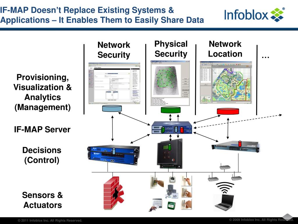 IF-MAP Doesn’t Replace Existing Systems & Applications – It Enables Them to Easily Share Data Physical Security Network Location Network Security … Provisioning, Visualization & Analytics (Management) IF-MAP Server Decisions (Control) Sensors & Actuators