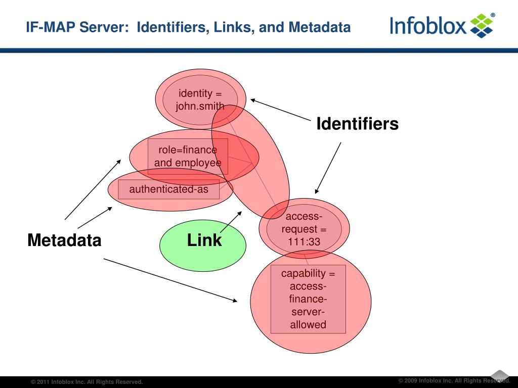 employee-attribute = active User Name = John Doe distinguished-name = C=US, O=myco, OU=people, CN=12534 Department = Sales failed-login-attempts = 3, login-status = allowed role = access-finance-server-allowed IF-MAP Components IF-MAP Client(s) IF-MAP Server IF-MAP Client Operations: Publish Subscribe Search MAP Server Objects: Identifiers Links Metadata