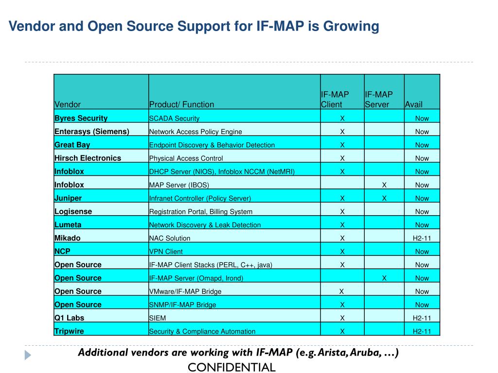 Vendor and Open Source Support for IF-MAP is Growing Additional vendors are working with IF-MAP (e.g. Arista, Aruba, …) CONFIDENTIAL