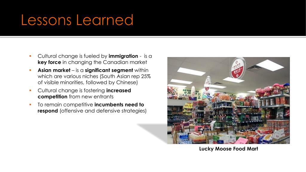 Lessons Learned • Cultural change is fueled by immigration - is a key force in changing the Canadian market • Asian market – is a significant segment within which are various niches (South Asian rep 25% of visible minorities, followed by Chinese) • Cultural change is fostering increased competition from new entrants • To remain competitive incumbents need to respond (offensive and defensive strategies) Lucky Moose Food Mart