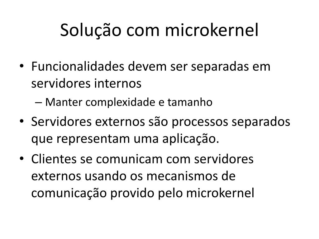 Solução com microkernel • Funcionalidades devem ser separadas em servidores internos • Manter complexidade e tamanho • Servidores externos são processos separados que representam uma aplicação. • Clientes se comunicam com servidores externos usando os mecanismos de comunicação provido pelo microkernel