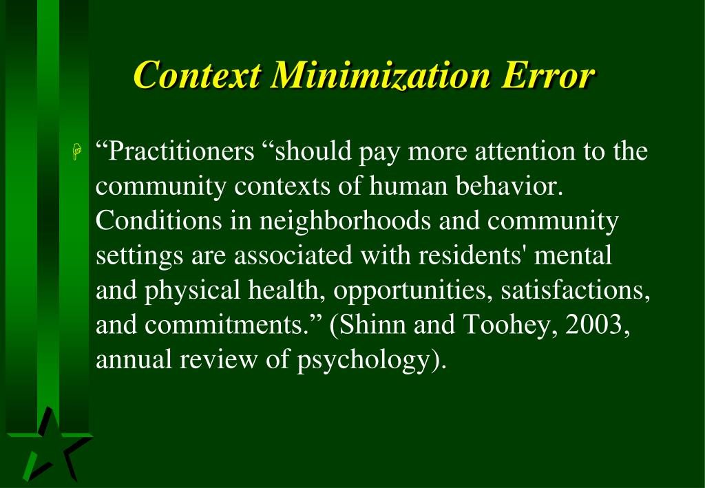 Context Minimization Error • “Practitioners “should pay more attention to the community contexts of human behavior. Conditions in neighborhoods and community settings are associated with residents' mental and physical health, opportunities, satisfactions, and commitments.” (Shinn and Toohey, 2003, annual review of psychology).