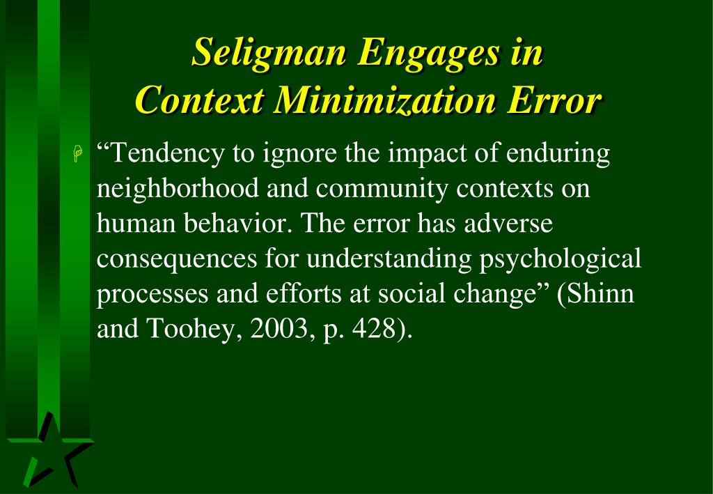 Seligman Engages in Context Minimization Error • “Tendency to ignore the impact of enduring neighborhood and community contexts on human behavior. The error has adverse consequences for understanding psychological processes and efforts at social change” (Shinn and Toohey, 2003, p. 428).