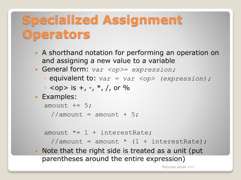 A shorthand notation for performing an operation on and assigning a new value to a variable • General form: var <op>= expression; • equivalent to: var = var <op> (expression); • <op> is +, -, *, /, or % • Examples: amount += 5; //amount = amount + 5; amount *= 1 + interestRate; //amount = amount * (1 + interestRate); • Note that the right side is treated as a unit (put parentheses around the entire expression) Specialized Assignment Operators Returned values >>>
