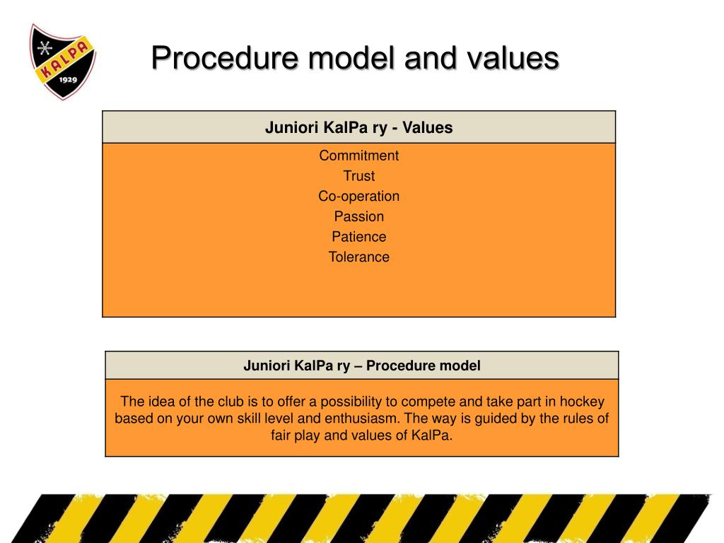 Sports and coaching system • Cooperative working and procedure is used as a ”guideline”, that helps to define more specific procedures and styles to achieve the objectives of the club (visions, strategies, goals) • The system has been built as a guideline for teams and partners when creating their own working models. They are to base their models from this to support the vision and values of Juniori-KalPa • Values and methods make a teams actions more simple and help in solving possible problems