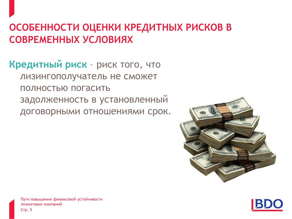 ОСОБЕННОСТИ ОЦЕНКИ КРЕДИТНЫХ РИСКОВ В СОВРЕМЕННЫХ УСЛОВИЯХ • Кредитный риск – риск того, что лизингополучатель не сможет полностью погасить задолженность в установленный договорными отношениями срок. Пути повышения финансовой устойчивости лизинговых компаний Стр.5
