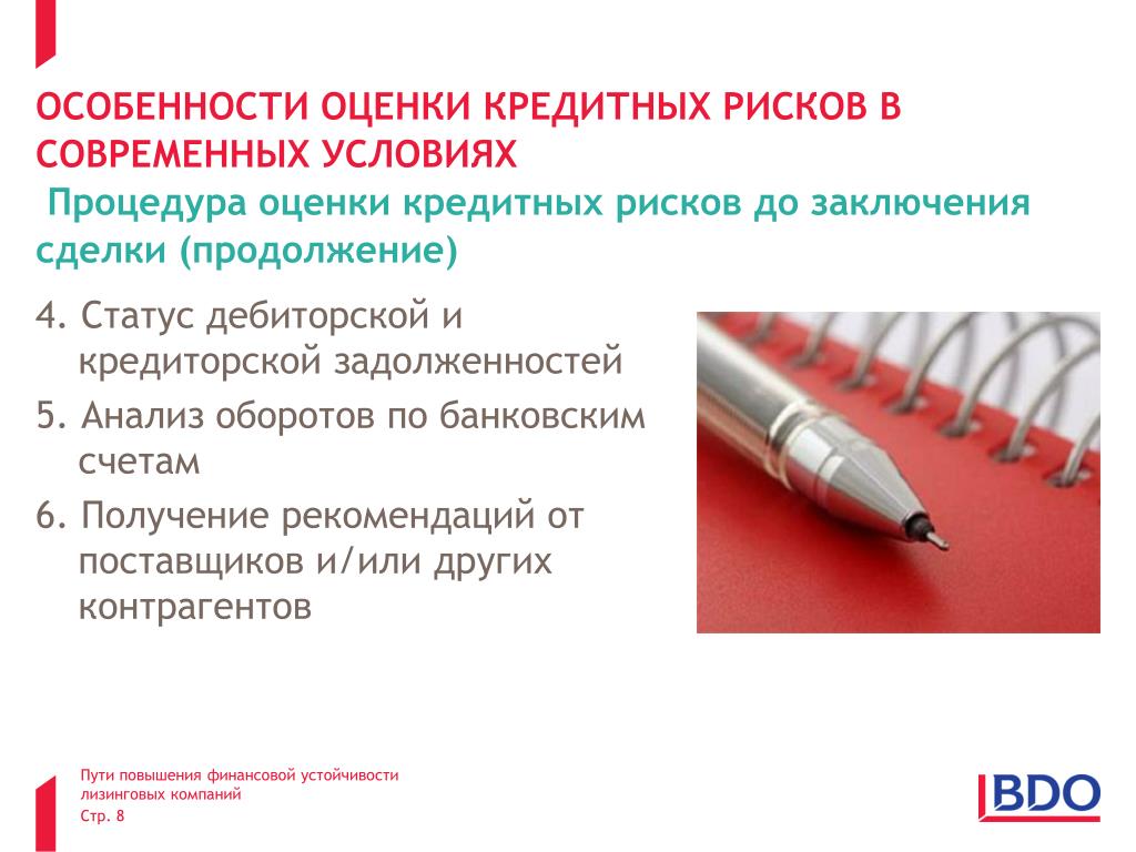 ОСОБЕННОСТИ ОЦЕНКИ КРЕДИТНЫХ РИСКОВ В СОВРЕМЕННЫХ УСЛОВИЯХПроцедура оценки кредитных рисков до заключения сделки (продолжение) • 4. Статус дебиторской и кредиторской задолженностей • 5. Анализ оборотов по банковским счетам • 6. Получение рекомендаций от поставщиков и/или других контрагентов Пути повышения финансовой устойчивости лизинговых компаний Стр.8