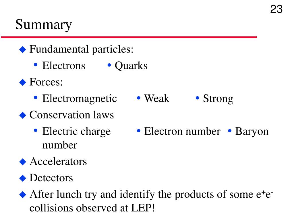 Summary • Fundamental particles: • Electrons Quarks • Forces: • Electromagnetic Weak Strong • Conservation laws • Electric charge Electron number Baryon number • Accelerators • Detectors • After lunch try and identify the products of some e+e- collisions observed at LEP!