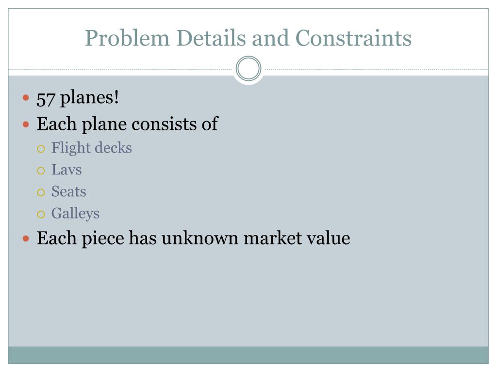 Problem Details and Constraints • 57 planes! • Each plane consists of • Flight decks • Lavs • Seats • Galleys • Each piece has unknown market value