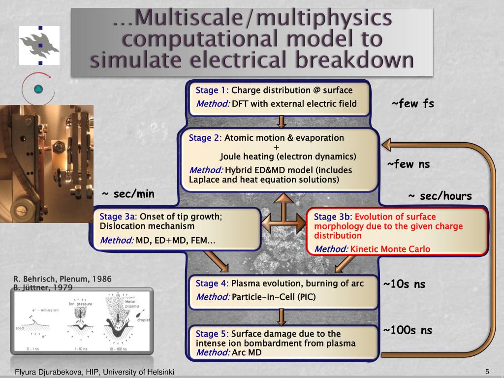 Outline • Basic outline of activities at Helsinki Institute of Physics and not only • Multiscale/multiphysics model to describe an arcing event • News: • Novel view on the “worm”-like features found in high resolution SEM images of electrical breakdown spots • The latest simulations coupling the dislocation activity in a stress concentrator and effect of electric field